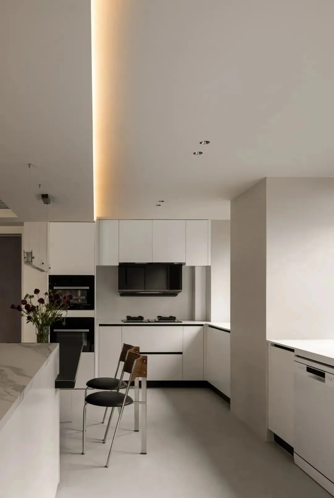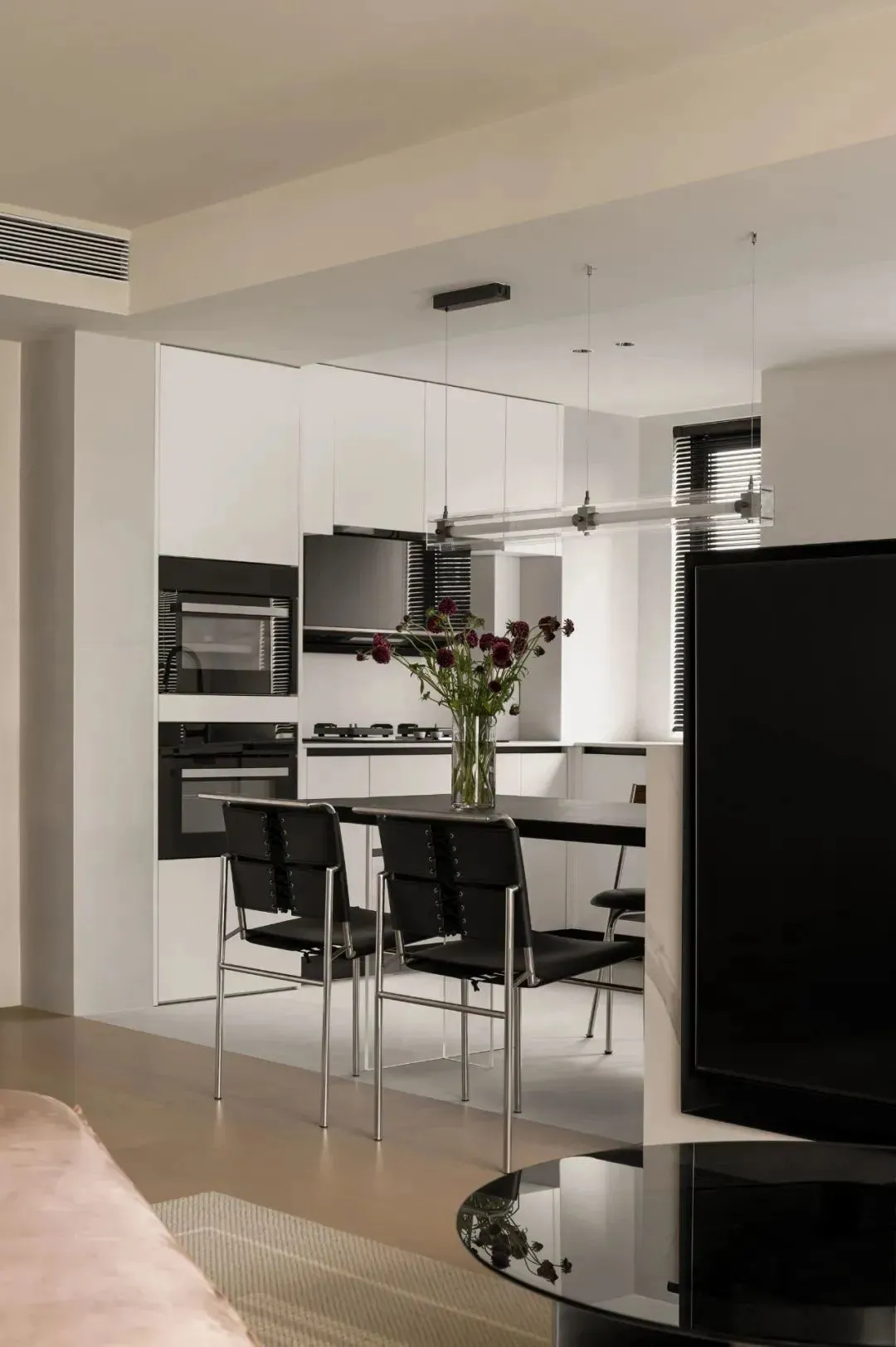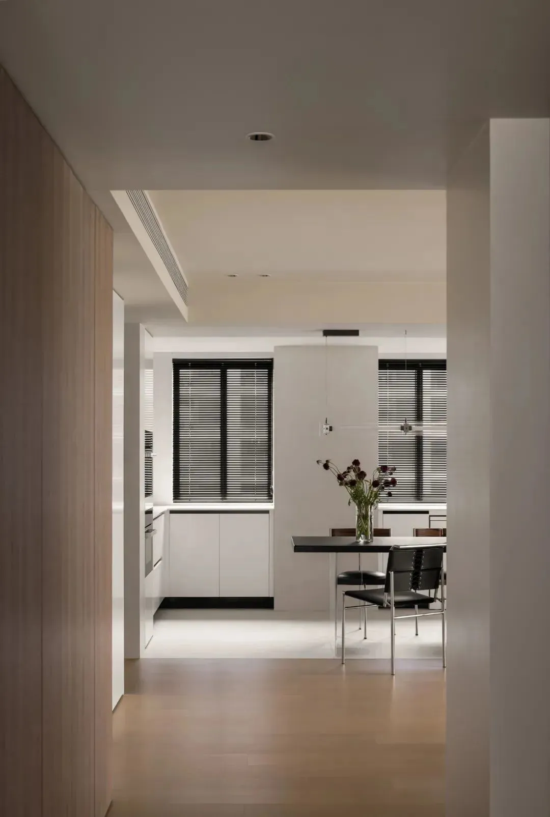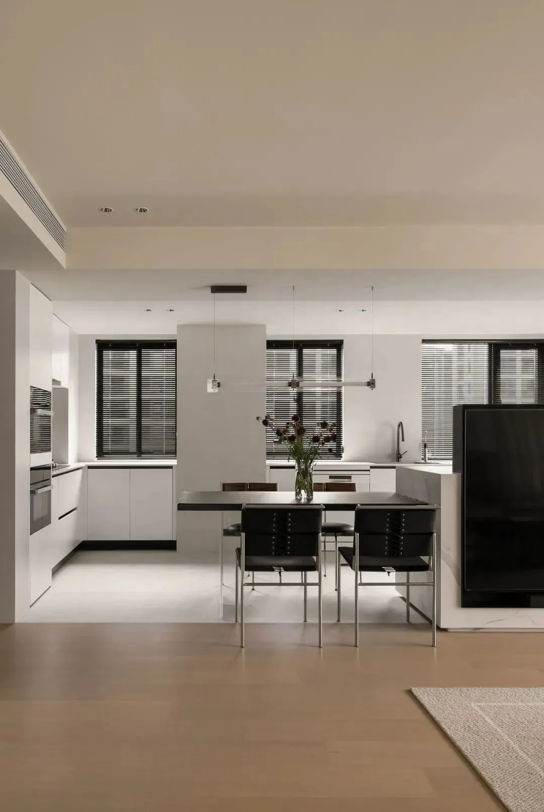 After the kitchen space is opened, the lighting in the public area is greatly improved, and the whole area is more transparent. The windows in the kitchen area are made of black venetian blinds, which are in sharp contrast with the white wall, which not only adds visual hierarchy and sense of high class, but also becomes the visual landing point of the space.