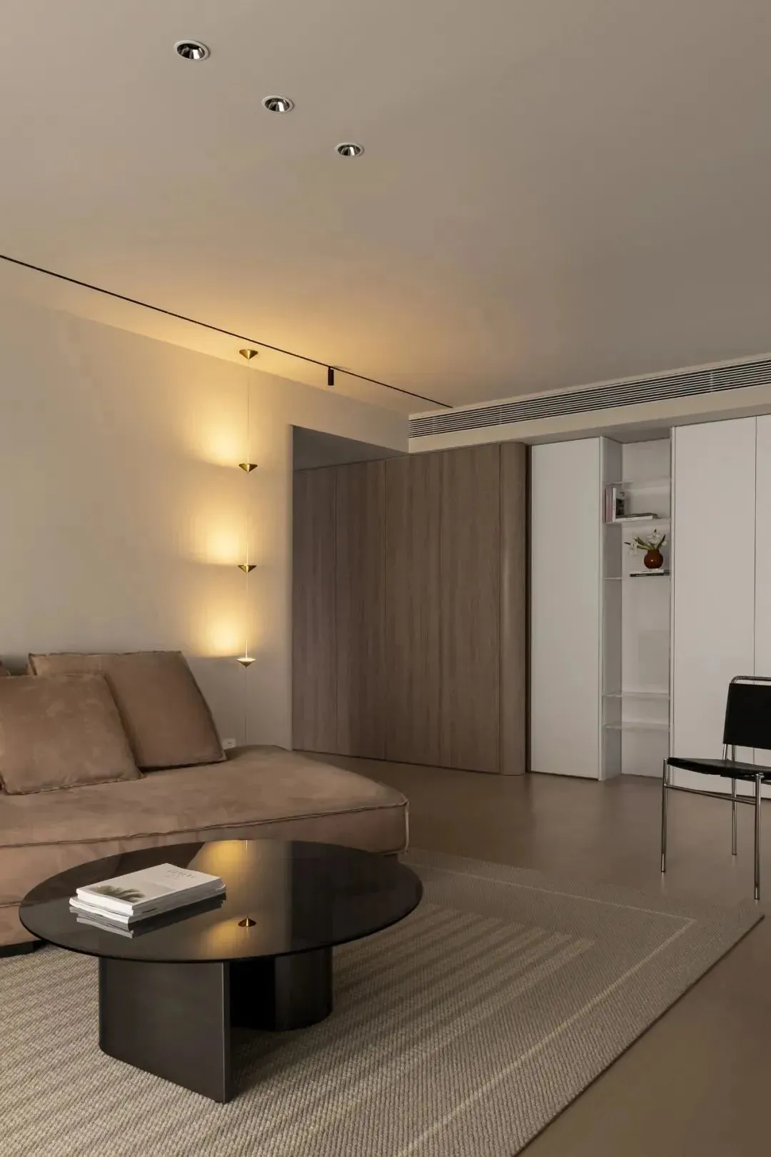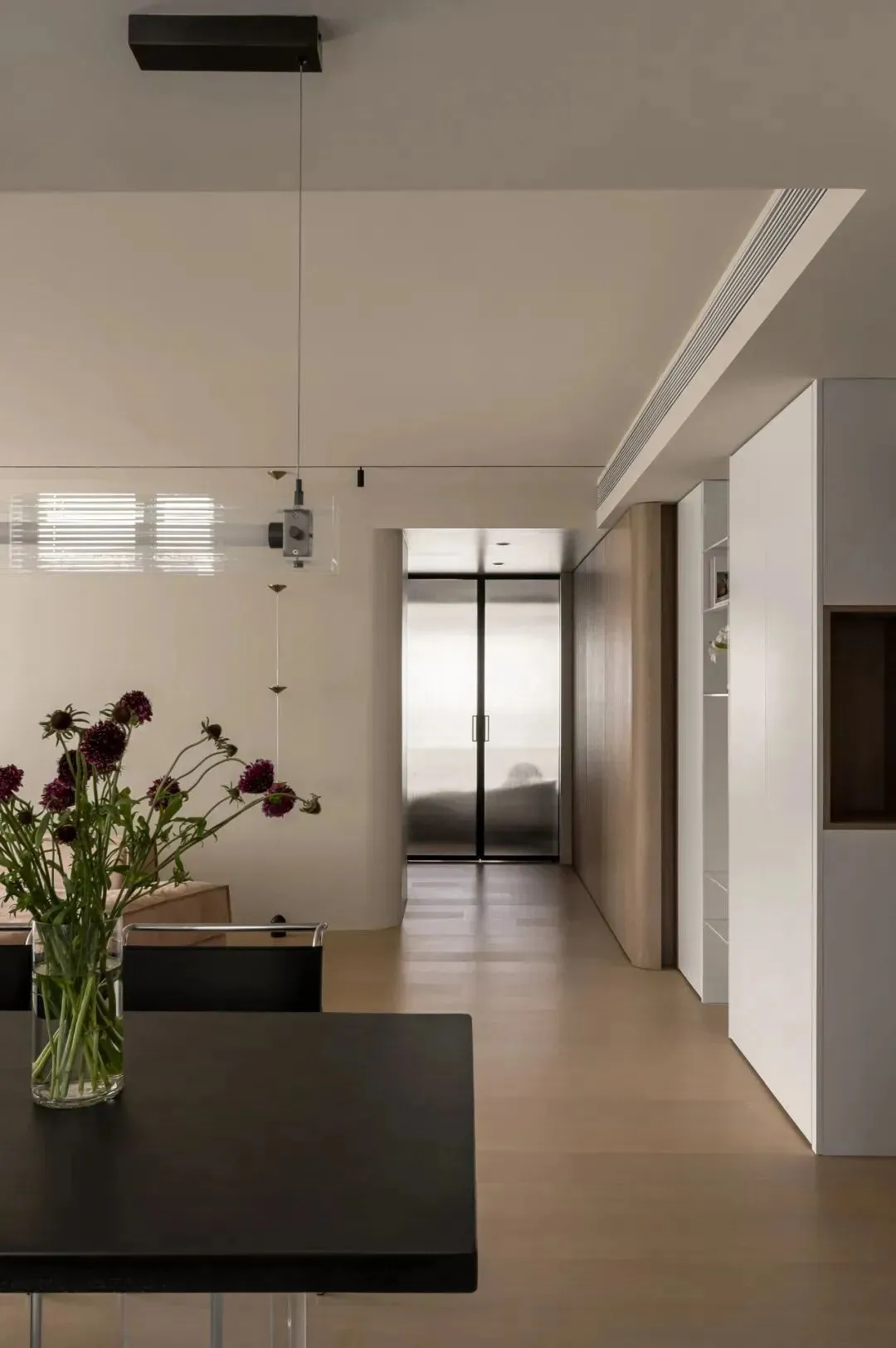 Faced with the challenge of a floor height of only 2.68 meters, the designer made great efforts in space transparency and light treatment. The lighting adopts a combination of downlights, spotlights and hanging chandeliers without main lamp design.