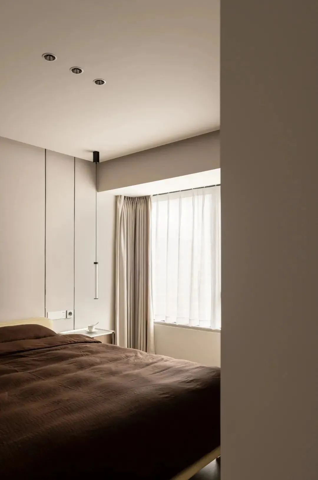 The master bedroom is matched with warm colors, and the calm brown bedding is intertwined with the warm milky latex paint wall, just like a cup of hot cocoa in winter, which warms people’s hearts.