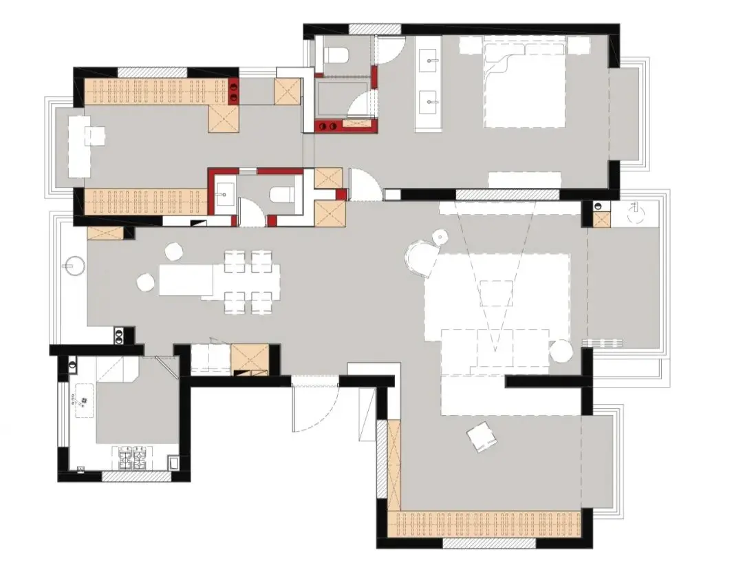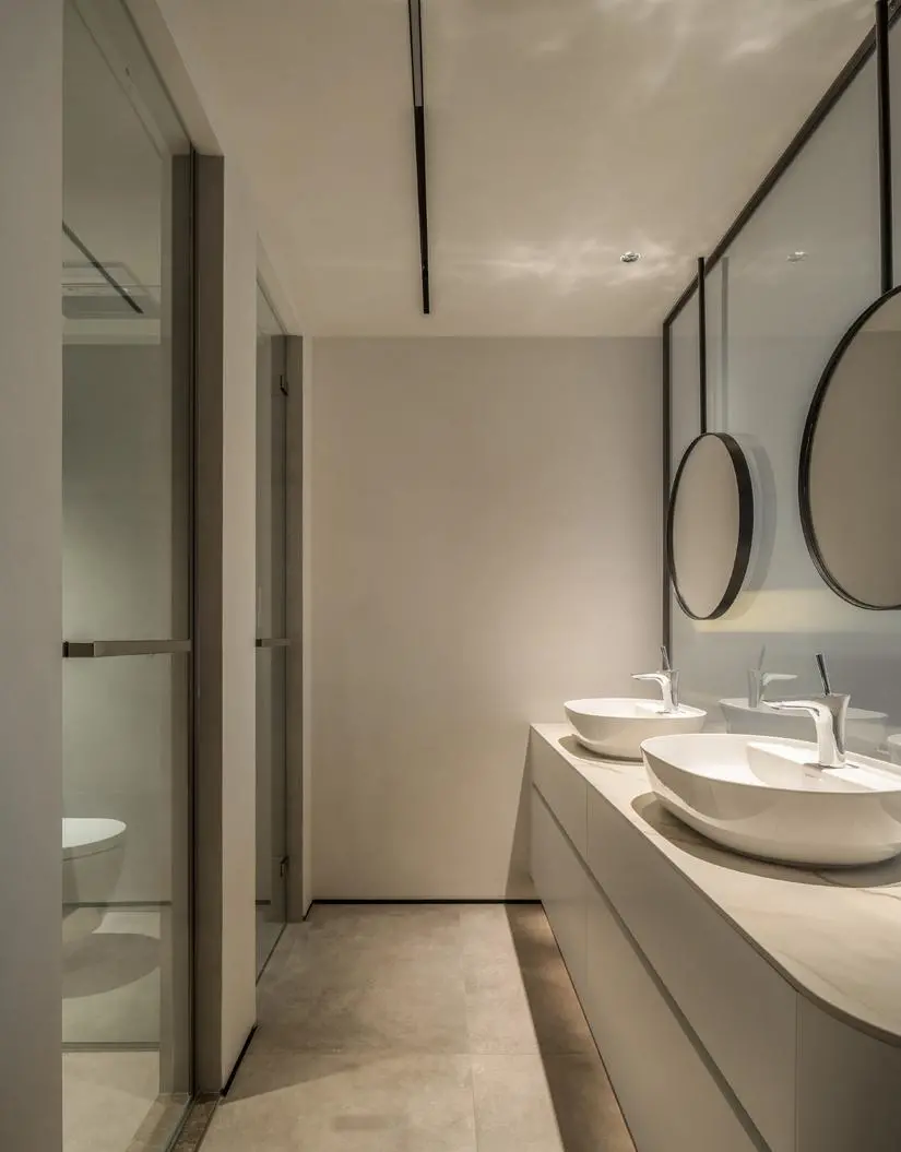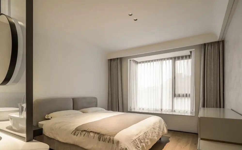 The main guard door is facing the bedside, partitioned by the wall combined with partial art glass, and a double washing area is set behind it. This not only blocks the bathroom door, but also makes the space appear more advanced.