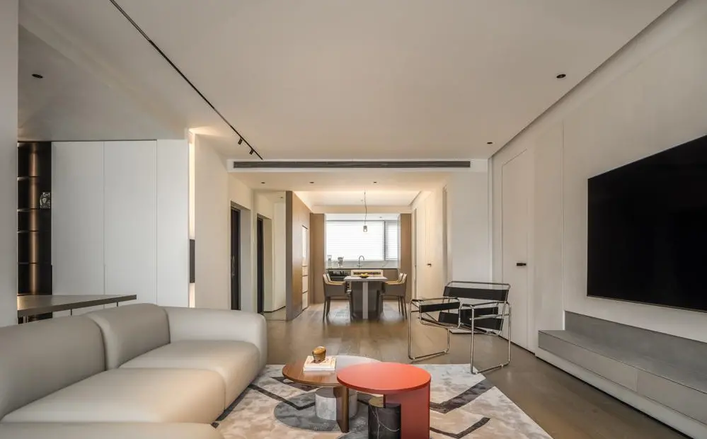 This is a set of120 ㎡ modern minimalist style caseWhile pursuing practicality and comfort, it also integrates the warmth and comfort that residents love into it, impressing people’s hearts with its unique charm. The whole large area of milky white is matched with log color, which is simple but warm. The main materials and furniture are mainly made of wood, while the soft furnishings are made of more silky materials. In the apartment structure, natural lighting is introduced to the greatest extent, making the whole space more transparent and bright.