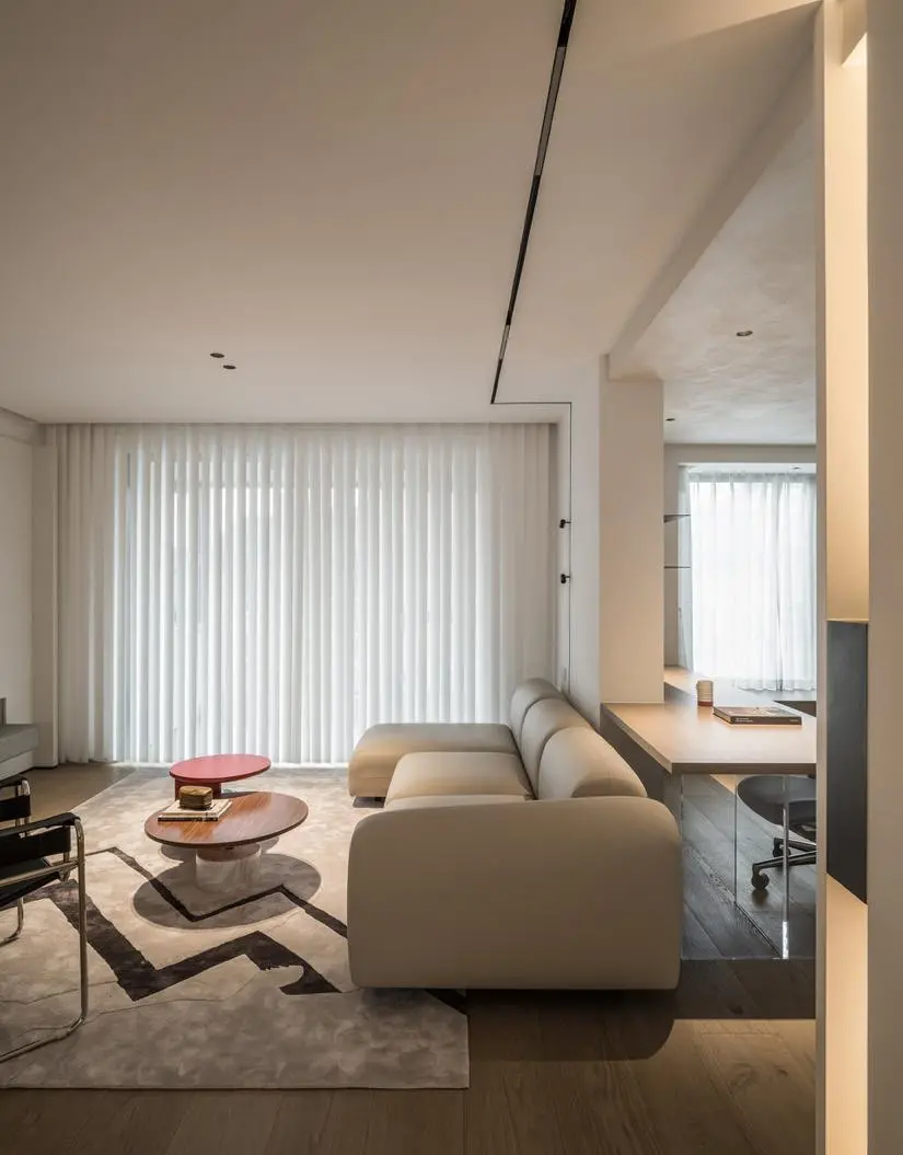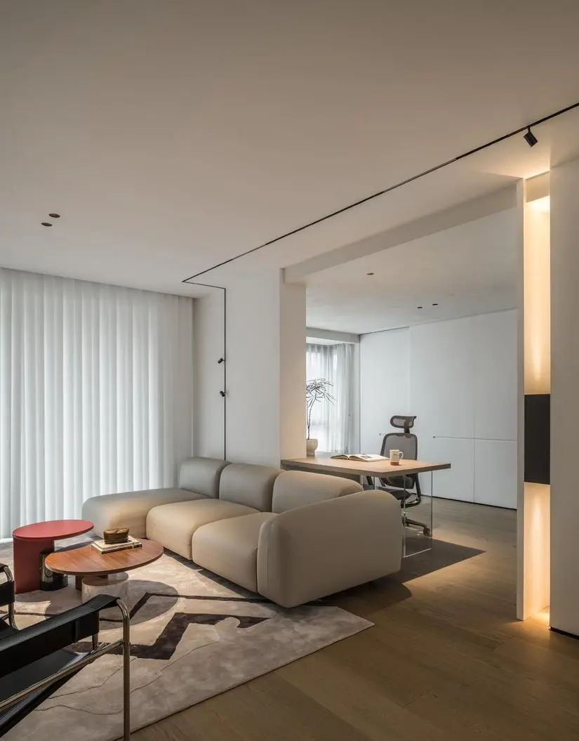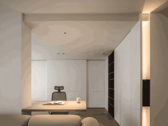 A multi-functional study is created behind the sofa. The dark storage compartment in the corner next to the desk is like an embellished painting. The long solid wood desk with light acrylic legs complements the simple layout and makes the whole space look extra smart.