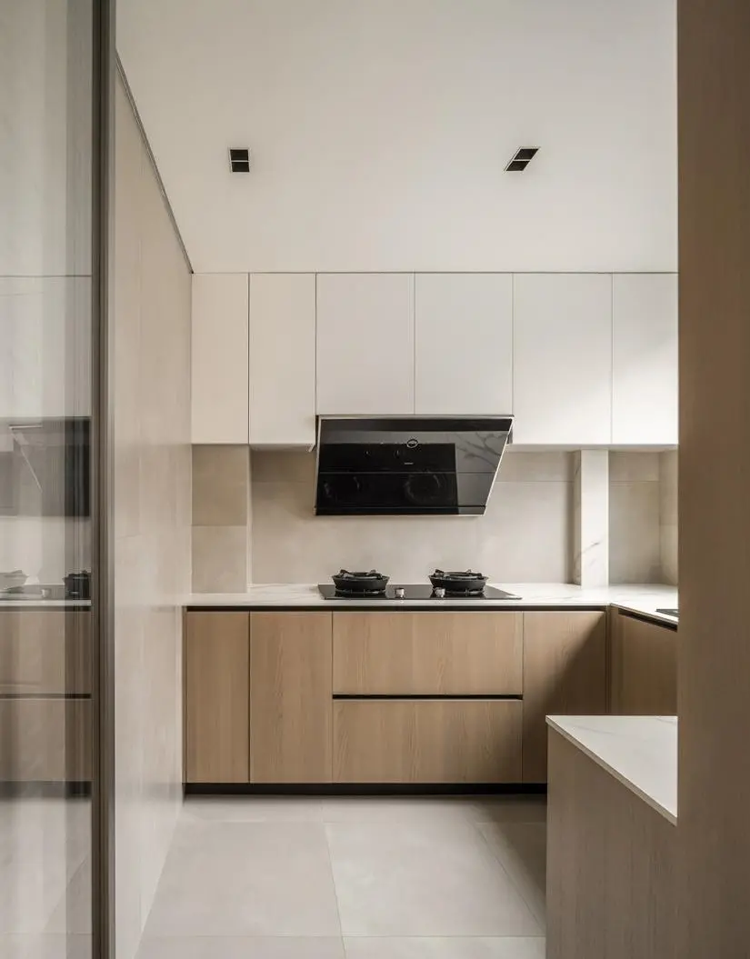 The kitchen adopts a U-shaped layout, with ample worktops and smooth moving lines, which is convenient for daily cooking. The cabinets choose the logs loved by the occupants to match with white, cook their favorite foods in the purest space, and enjoy the process as well as the results.