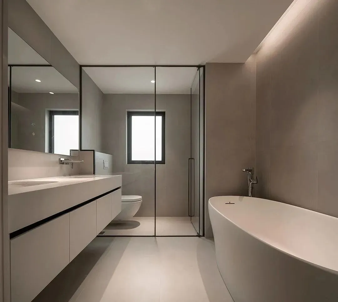 The bathroom is dominated by white and gray, creating a clean and pure atmosphere. The minimalist design of white sink and cabinet is simple and attractive but elegant.