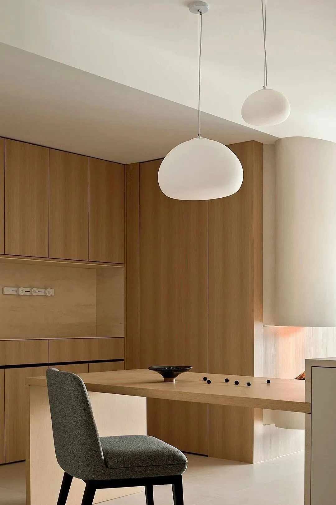 The integrated design of the dining island is just right, which makes the moving lines between the three functional areas of cooking, dining and social interaction smooth, interlocking, intimate and orderly. It not only avoids the sense of crowding, but also makes the space full and moderate, achieving a perfect balance.