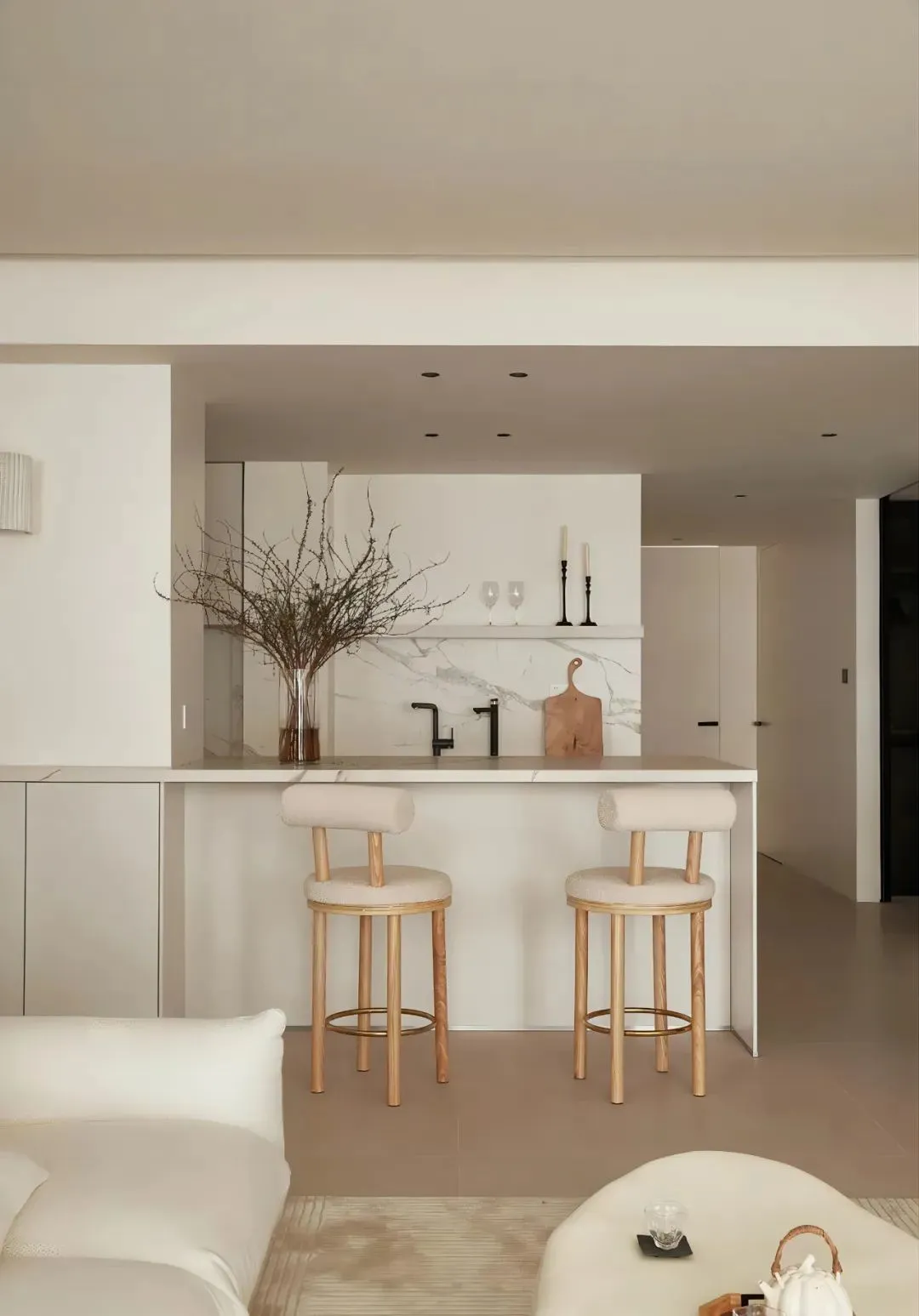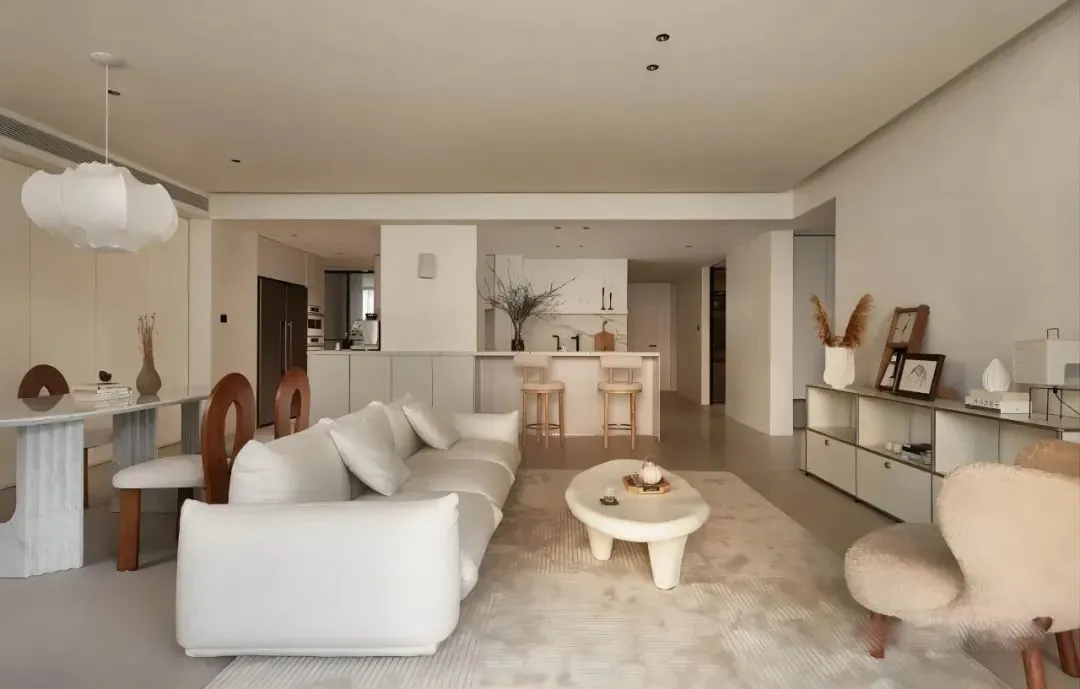 The integrated design of guest and dining room makes the whole public area open and bright. In the layout of the horizontal hall, the low “marshmallow” sofa is placed in the center, surrounding a comfortable leisure core area.