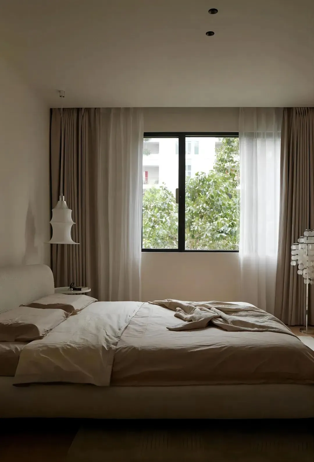 The design of the master bedroom is refreshing and atmospheric, and the wall is painted with cream paint, which makes people relax naturally as soon as they enter. The bamboo chandelier is warm and stylish, the fabric curtains filter out soft light and shadow, and the lazy and comfortable atmosphere lingers in the whole bedroom.