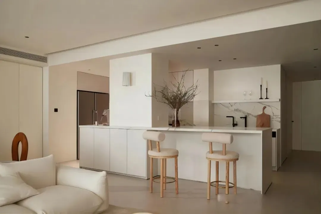 The customized bar counter is set parallel to the kitchen console, and the load-bearing column is skillfully wrapped, taking into account both beauty and practicality. The whole operation line is comfortable and convenient. It is not only a simple dining area, but also a good place for tea and drinks.