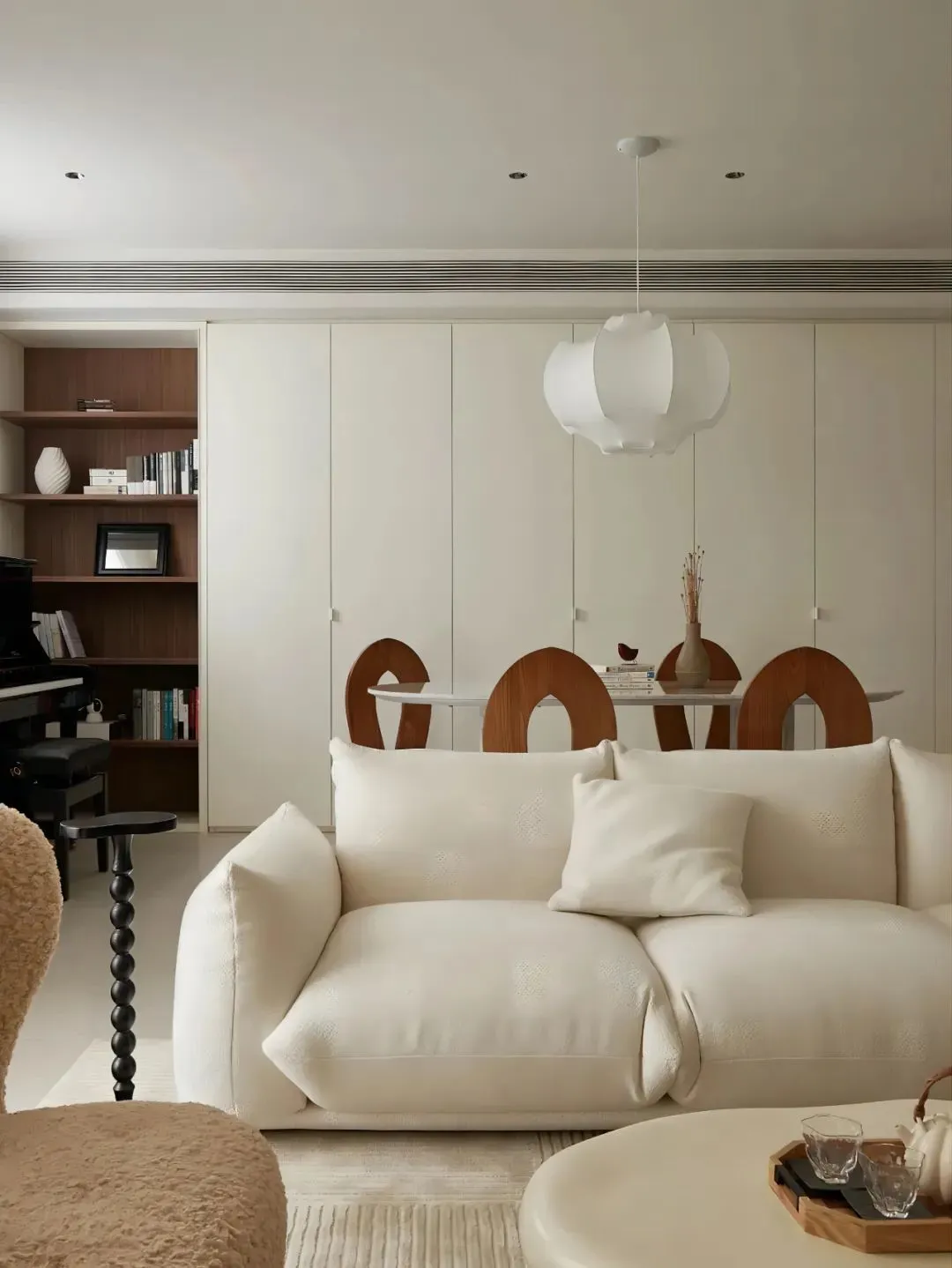 The whole-wall custom cabinet from one door to the top is perfectly integrated with the overall style. The simple cabinet design weakens the existence of the storage cabinet and highlights the minimalist charm.