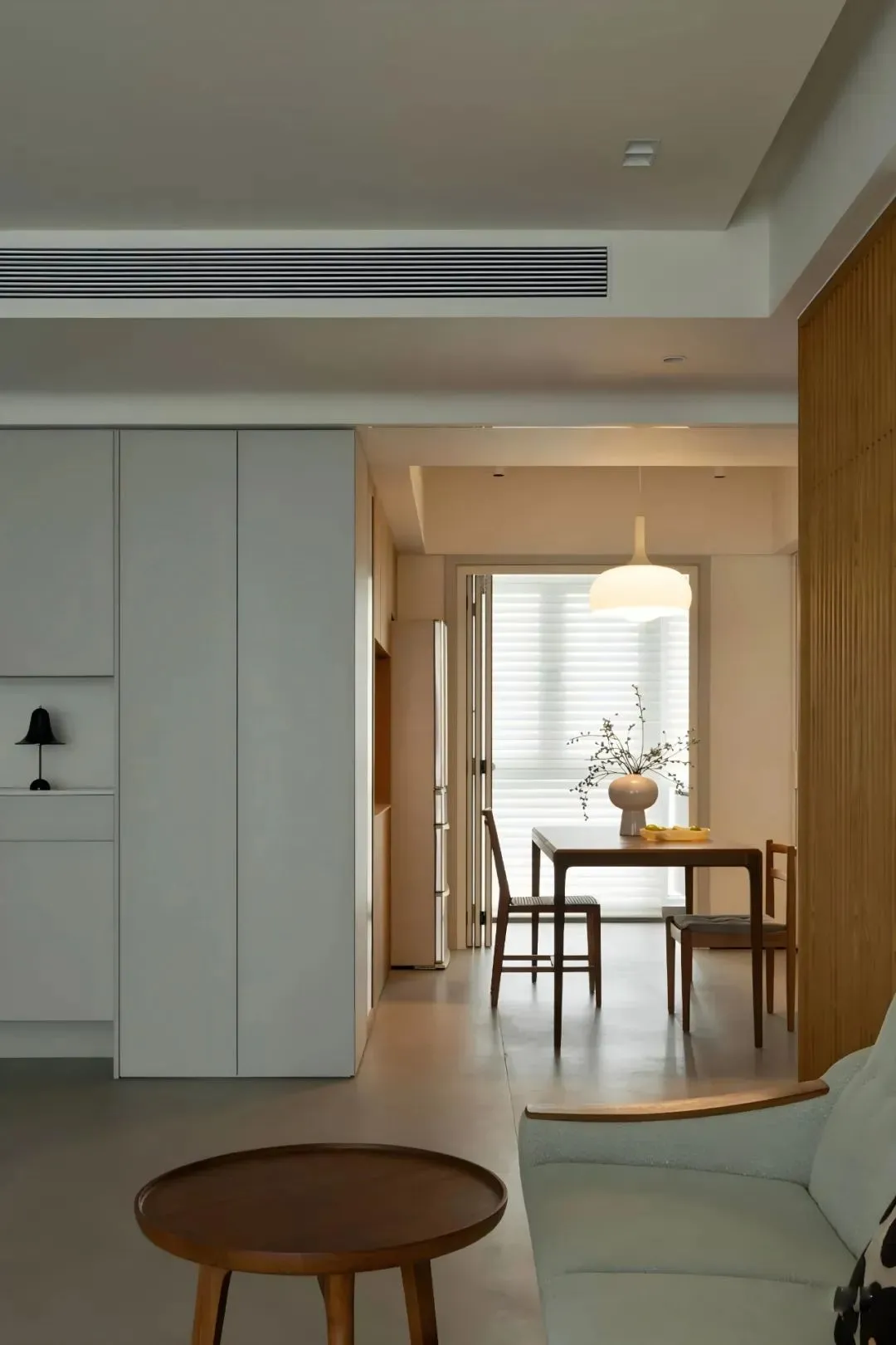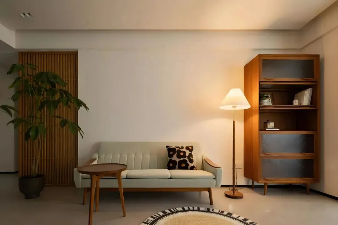 As a master of atmosphere creation, pleated floor lamps stand quietly in the corner, accompanied by wooden grids and green plants, and light and shadow are intertwined, which quietly enhances the warmth of home.