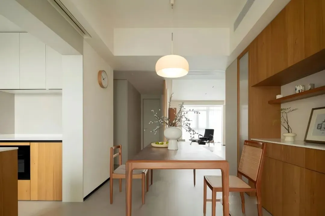The walnut dining table and chairs are classic and rich in texture, and a cream chandelier lights up the style of dining. Double/triple sliding doors cleverly divide the dining area and washing area; The customized sideboard takes into account both storage and display functions.
