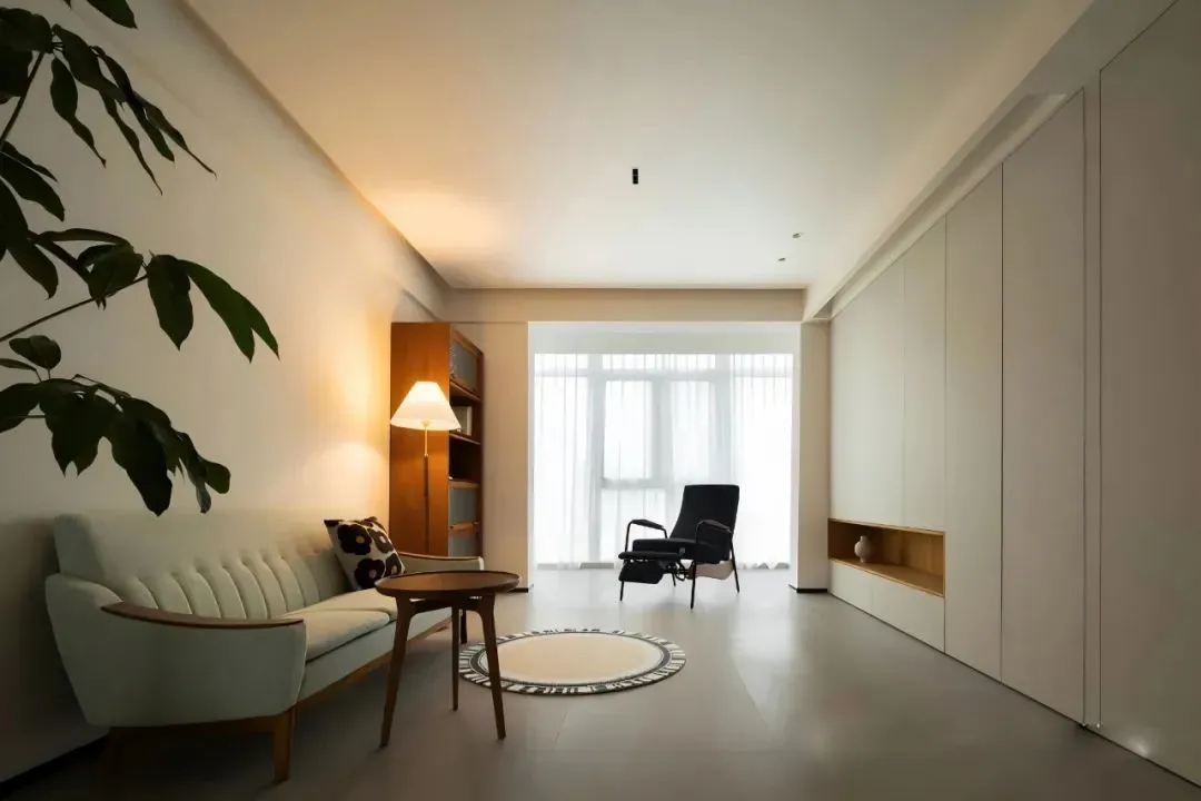 The living room features low saturation tones that appear comfortable and natural against soft light. The custom storage cabinet on the whole wall is simple and practical, and a curtain slot is reserved at the top, which is convenient for family viewing.