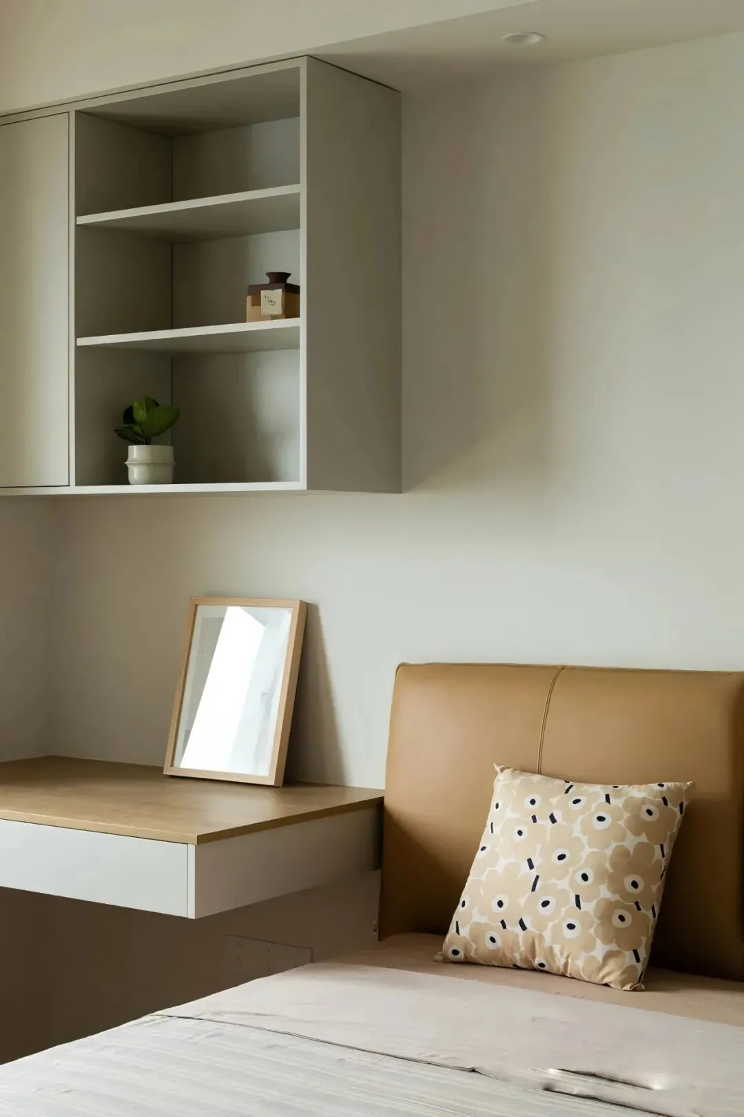 The second bedroom makes full use of the original apartment structure, and designs a suspended desk along the window, which extends to the bedside to meet the needs of daily storage and learning. The corners are softly curved. The upper hanging cabinet is equipped with an open compartment, which is convenient for storing books and small ornaments.