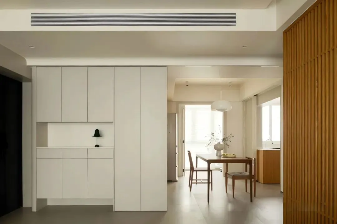 The entrance hall adopts a customized cabinet, with an empty space in the middle for easy placement of keys and other small objects, while the suspended bottom is used to store often worn shoes, which is convenient and tidy.