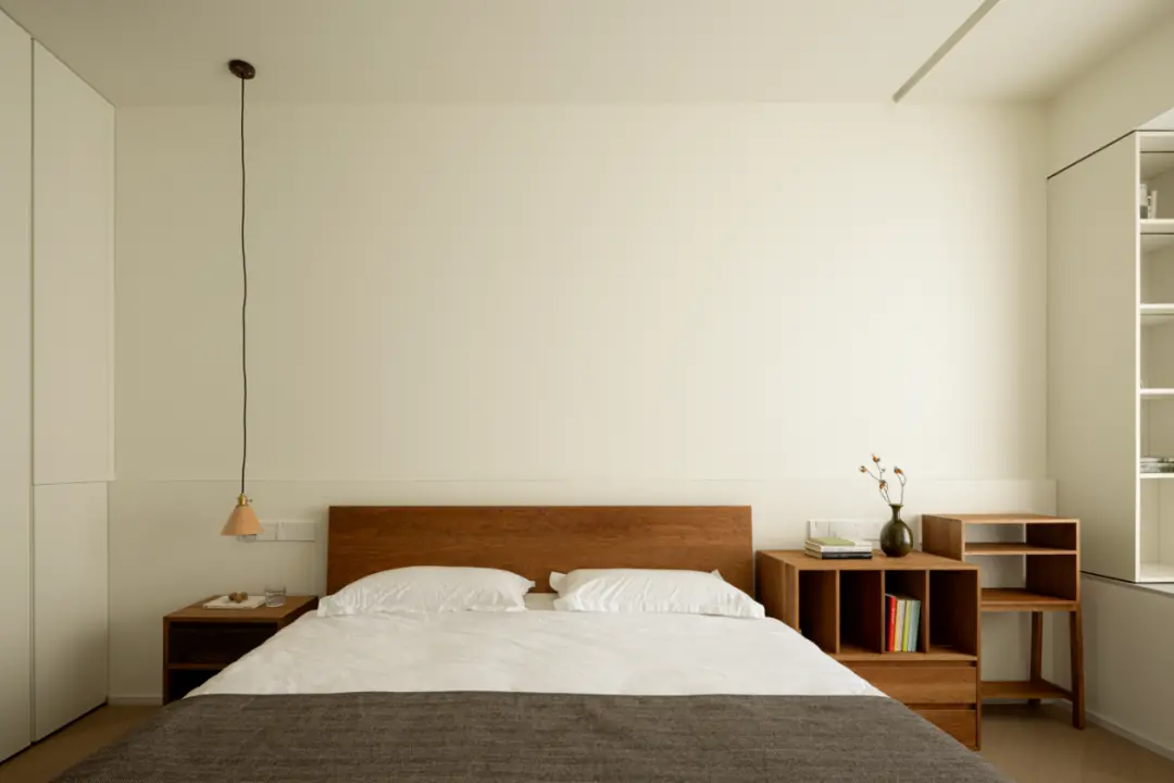 The custom-made high cabinet at the end of the bed, and the handleless cabinet door design avoids visual clutter and continues the overall minimalist language.