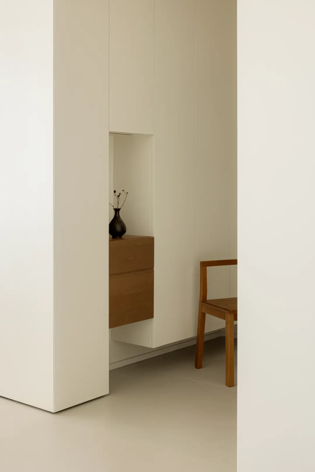 The suspended chest of drawers embedded in the whole wall cabinet is like an end scene, finding a balance between practicality and aesthetics, and the embellished floral arrangement is the finishing touch, adding vitality and temperature to the space.