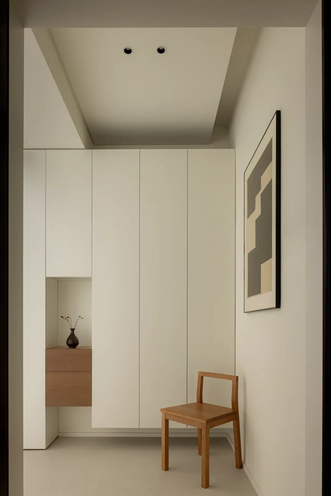 Cabinets are designed on both sides of the entrance to increase storage space as much as possible. The combination of warm white and wood veneer makes people feel relaxed as soon as they enter the door, and the clean environment creates a casual and comfortable atmosphere.