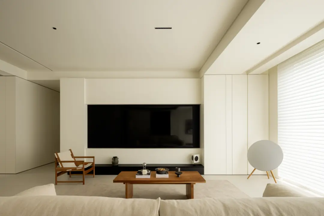 The living room is developed in a minimalist tone, with light-colored soft-light bricks paved throughout, and the openness of the space is expressed through the walls and ceilings. The TV background wall is based on warm white and combined with black blocks, just like black and white works of art, which not only avoids emptiness, but also adds layers to the space.