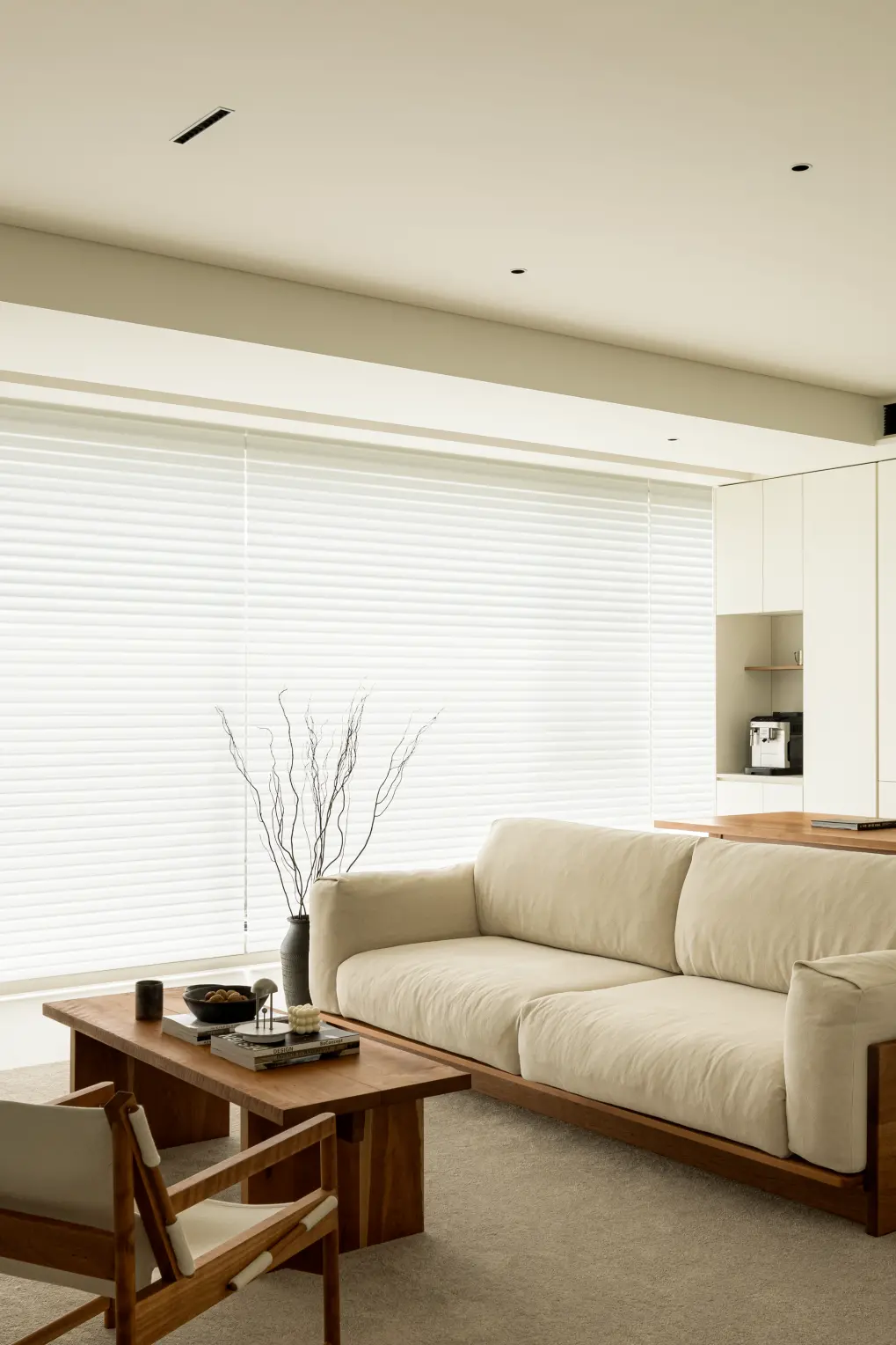 After the balcony is merged into the living room, the load-bearing wall that cannot be dismantled is cleverly decorated with the help of the cabinet, which integrates the living room and balcony, and also increases the storage function. Large floor-to-ceiling windows with venetian blinds allow natural light to fill the entire living room, creating a warm and comfortable atmosphere.