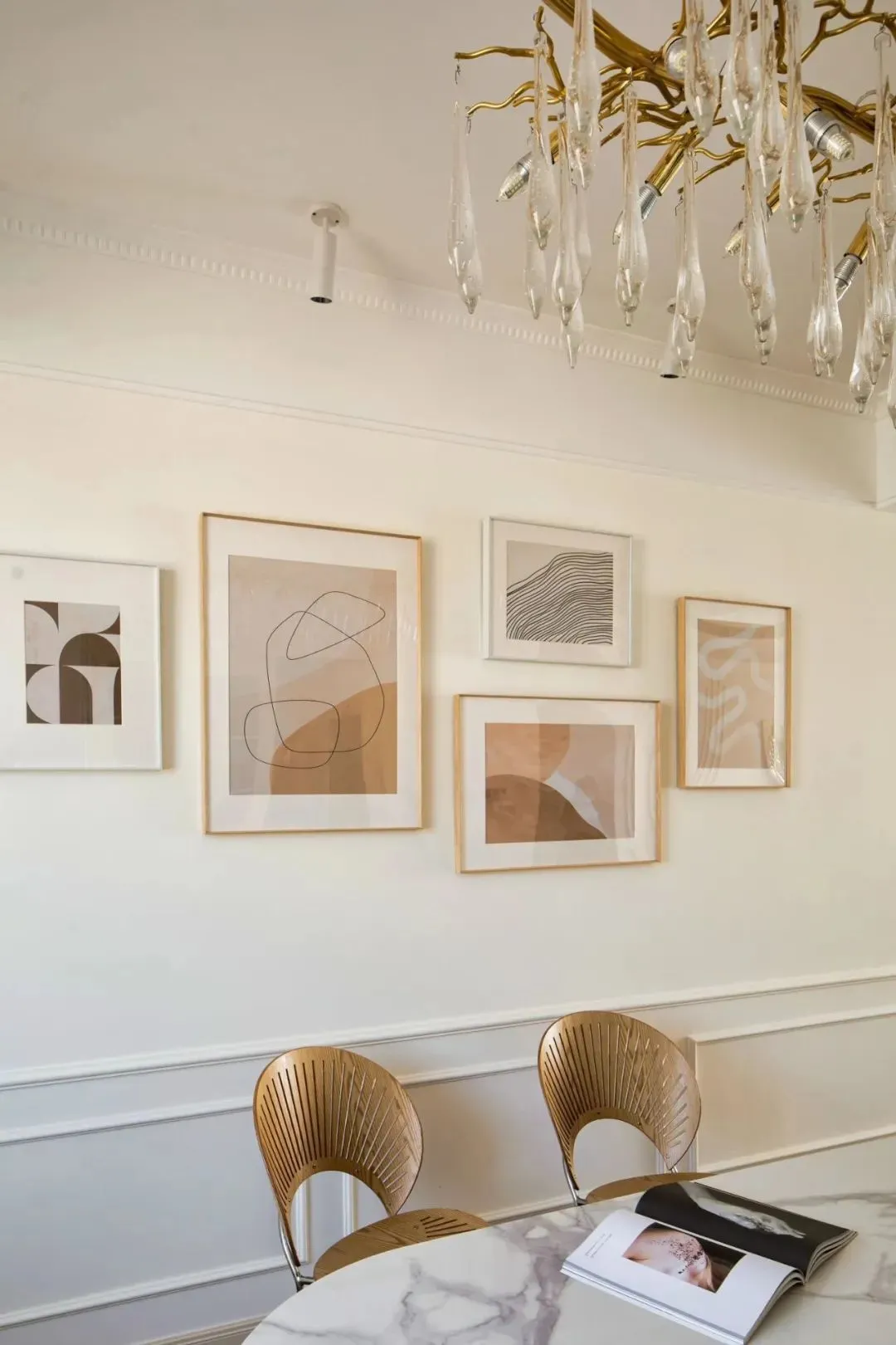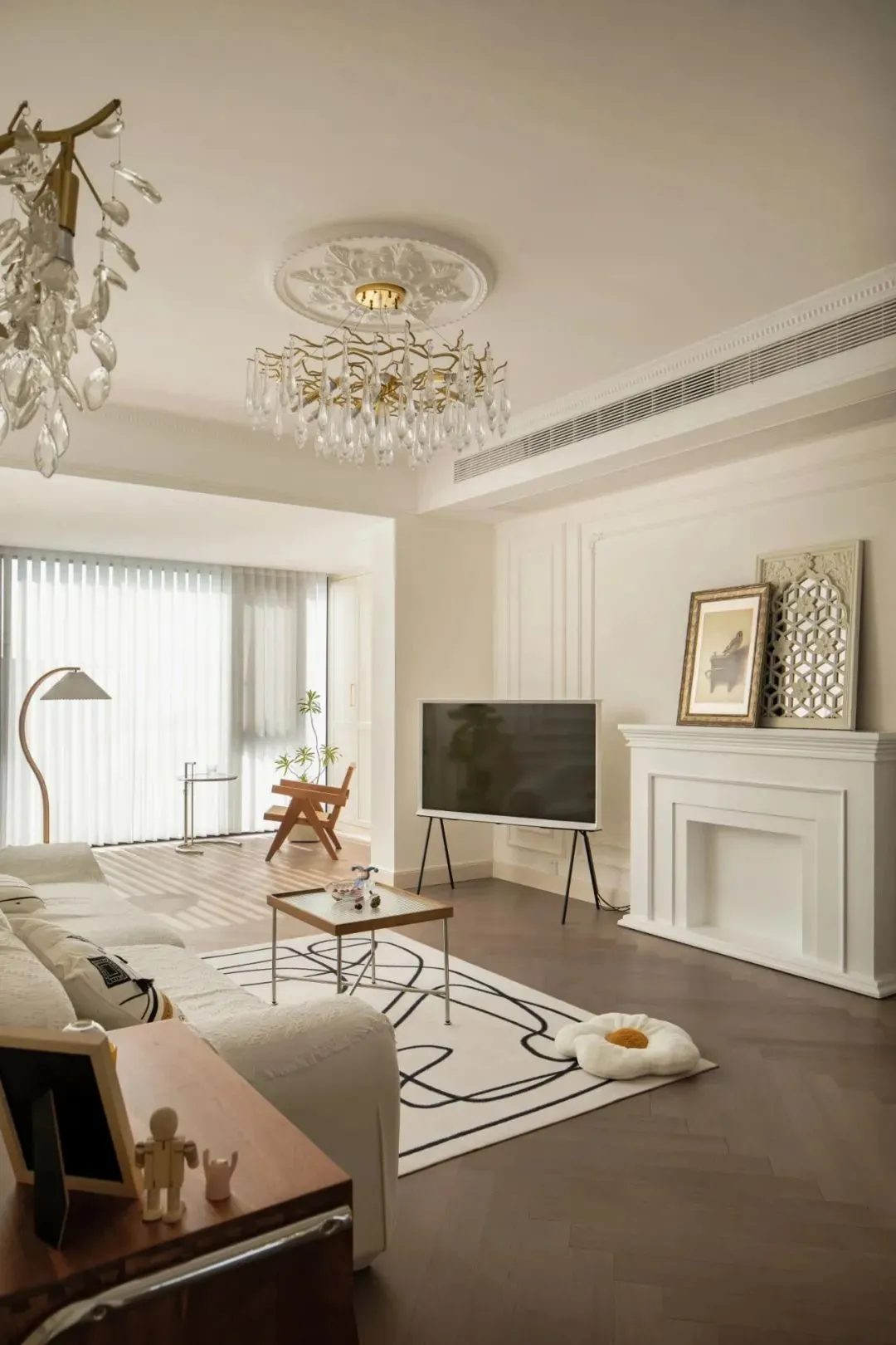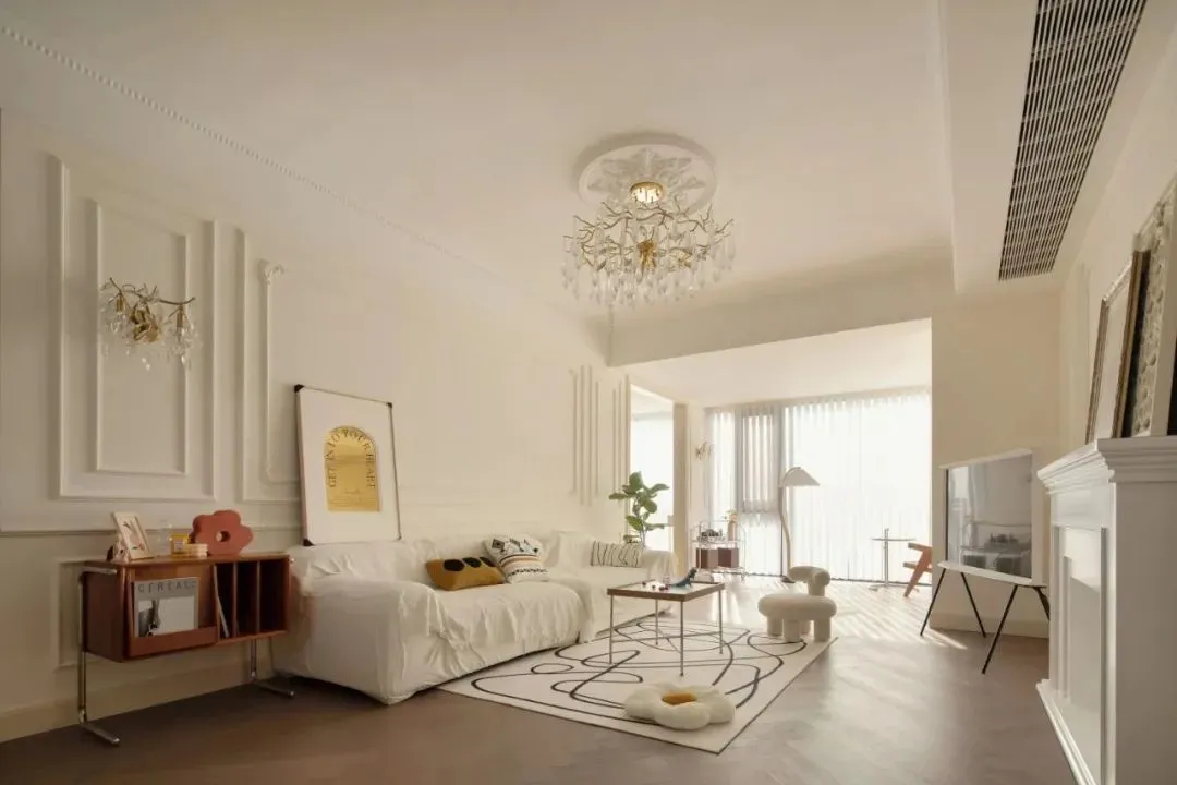 A large area of milk coffee color shows the gentle feeling of home years. The whole house is paved with herringbone oak floors, and the laying direction is consistent with the light, creating a smooth sense of extension. Coupled with the embellishment of French plaster lines and carved shapes, elegance and romance coexist.