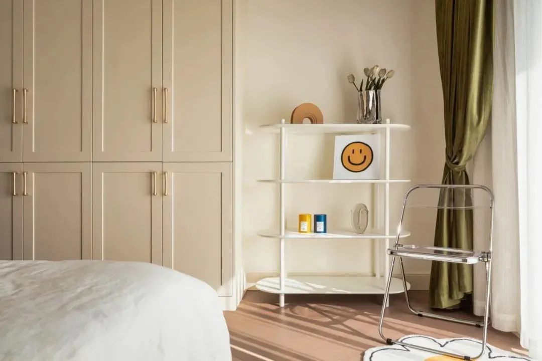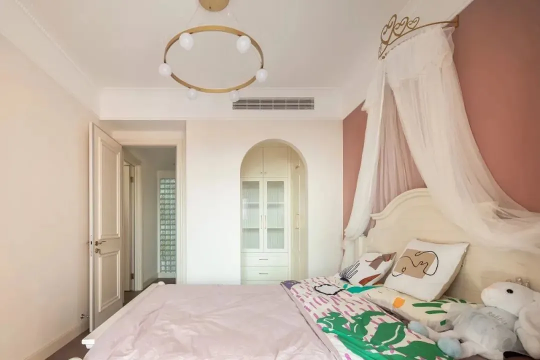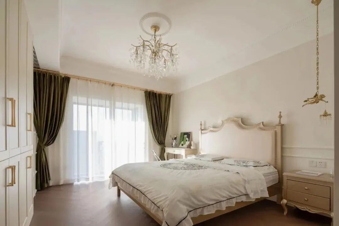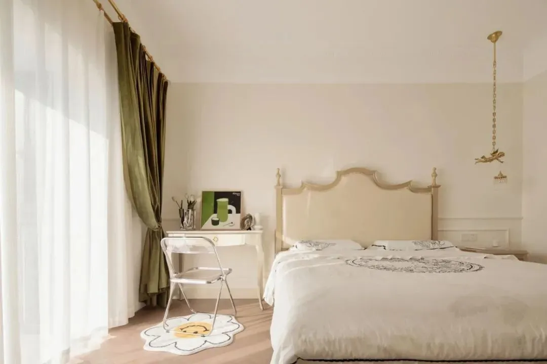The bedside backdrop wall adds plaster line detail to reflect the little delicacy that is everywhere. In order to adapt to the habits of residents, a bedside table and a long chandelier are set on the side of the bed to facilitate night reading; The dressing table is placed on the other side, creating a convenient and elegant living atmosphere for the owner.