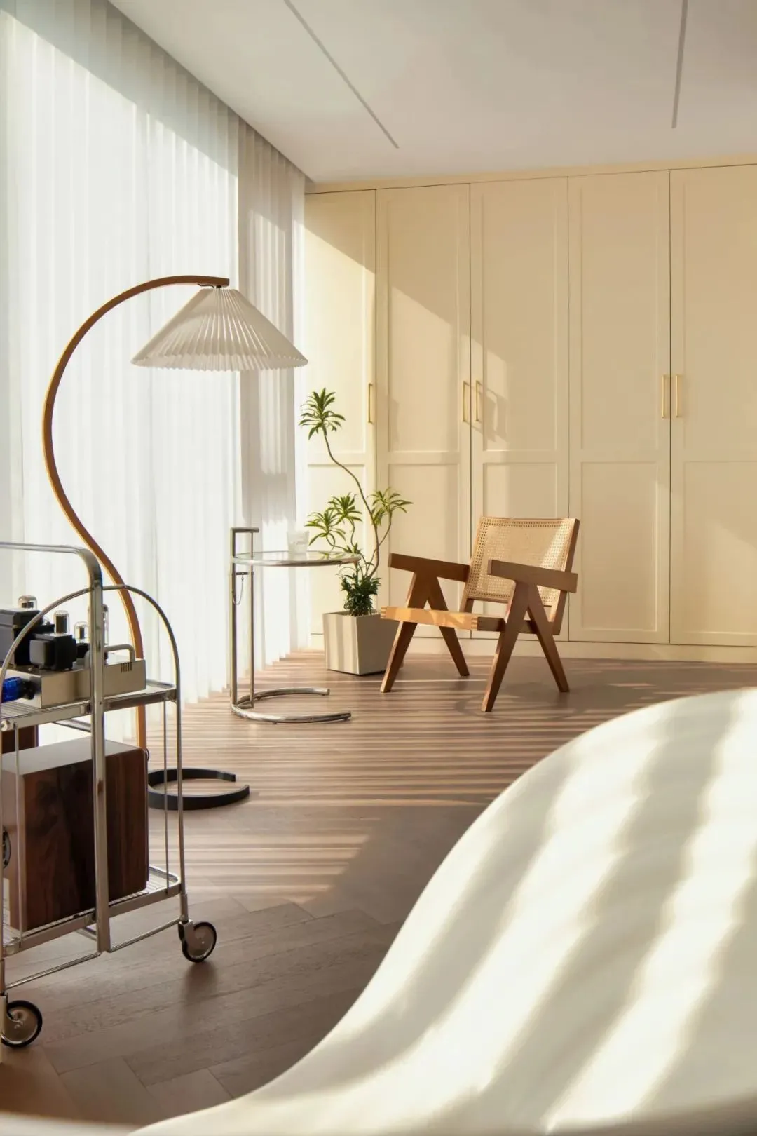 A whole row of wardrobes was customized at the end of the bed, and a touch of brass lit up the pure white cabinet, making the large area of white space no longer monotonous.