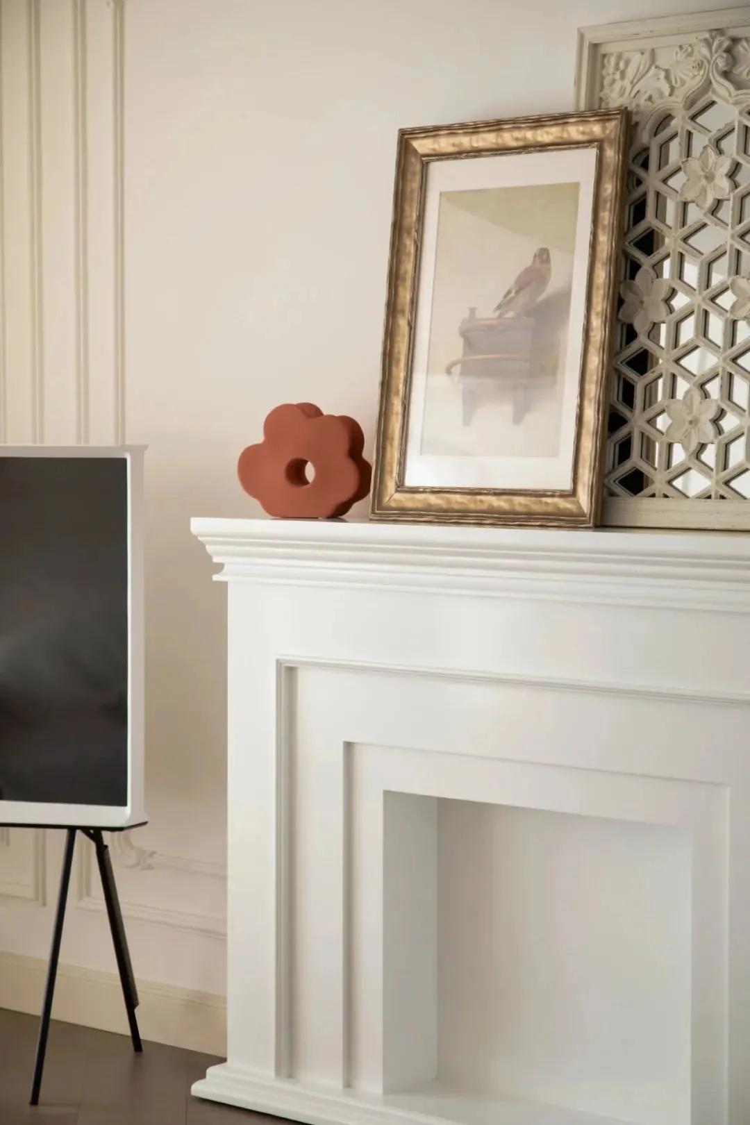 Instead of mounting the TV on the wall, a more flexible way is adopted. The bracket is placed in the corner of the TV wall, and the fireplace becomes the visual center. It is not only decoration, but also bears good wishes-the flame leaping in the fireplace breeds a beautiful fairy tale fantasy in the light.