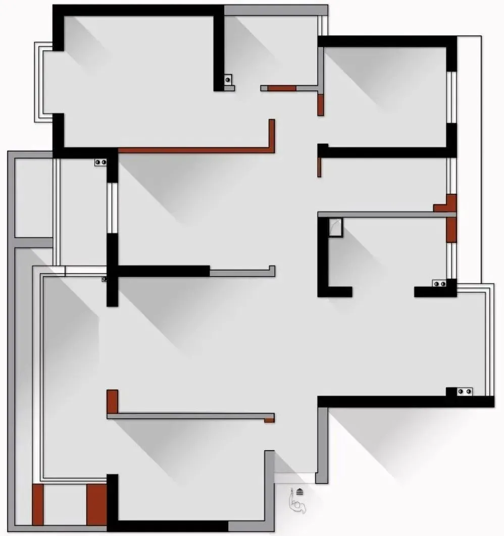 The completely open space is merged into the living room, giving enough openness to the home and life; The beams that cannot be removed are treated with suspended ceilings combined with embedded light strips to add a sense of lightness; The wall that cannot be dismantled is hidden in the cabinet, which also reserves more storage possibilities for future life.