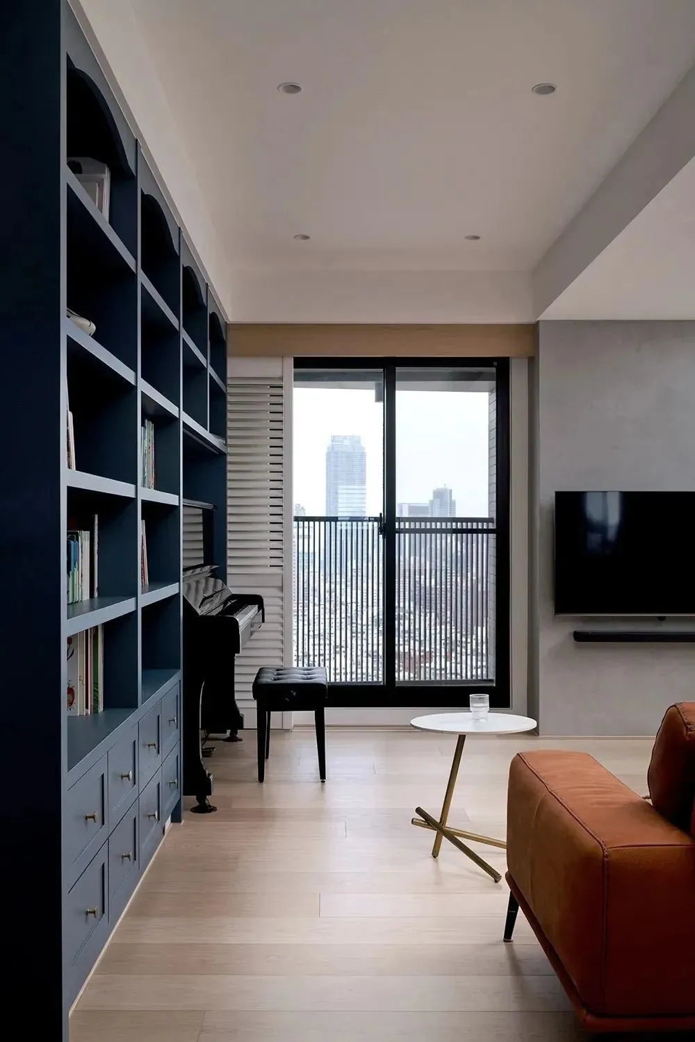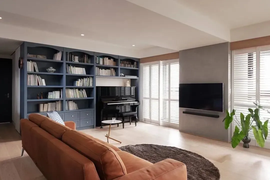In order to meet the reading needs of the whole family, the living room has created a whole bookcase with simple and symmetrical lines. At the same time, an exclusive position is reserved for the male owner’s piano. The interweaving of scholarly piano rhyme makes the living room not only a reception space, but also a family core area full of cultural atmosphere.