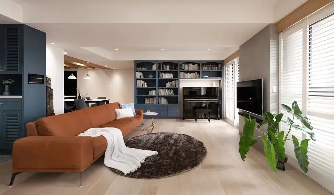 The living room boasts excellent lighting surface. In order to let the light gently flood into the room, all floor-to-ceiling windows are equipped with white wooden venetian blinds, and the sunlight can be adjusted at any time, becoming a flowing landscape in the home. In order to keep the light-facing surface transparent and open, the TV wall did not have a complex shape. Only the wall between the windows was painted with a special paint with plaster texture, which naturally integrated with the window frame and became integrated.