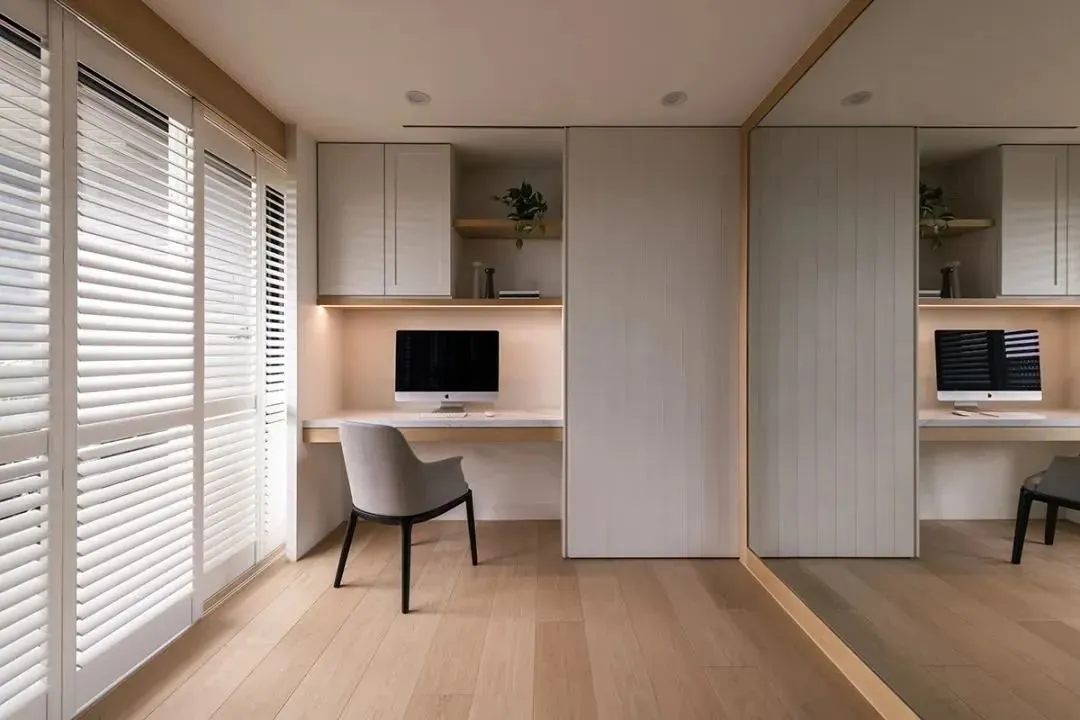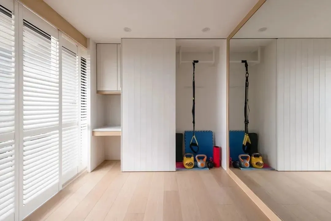 A chic sliding door with wide lines, gives this space a dual identity. Slide the door to the left, and it becomes a home gym, where sports equipment can be easily stored. When the door slides to the right, there are desks, lights and lockers hidden inside, and the reading corner becomes quiet in seconds. Accompanied by sunshine and full-length mirror, whether yoga, meditation or quiet reading, you can find your own moment of peace.