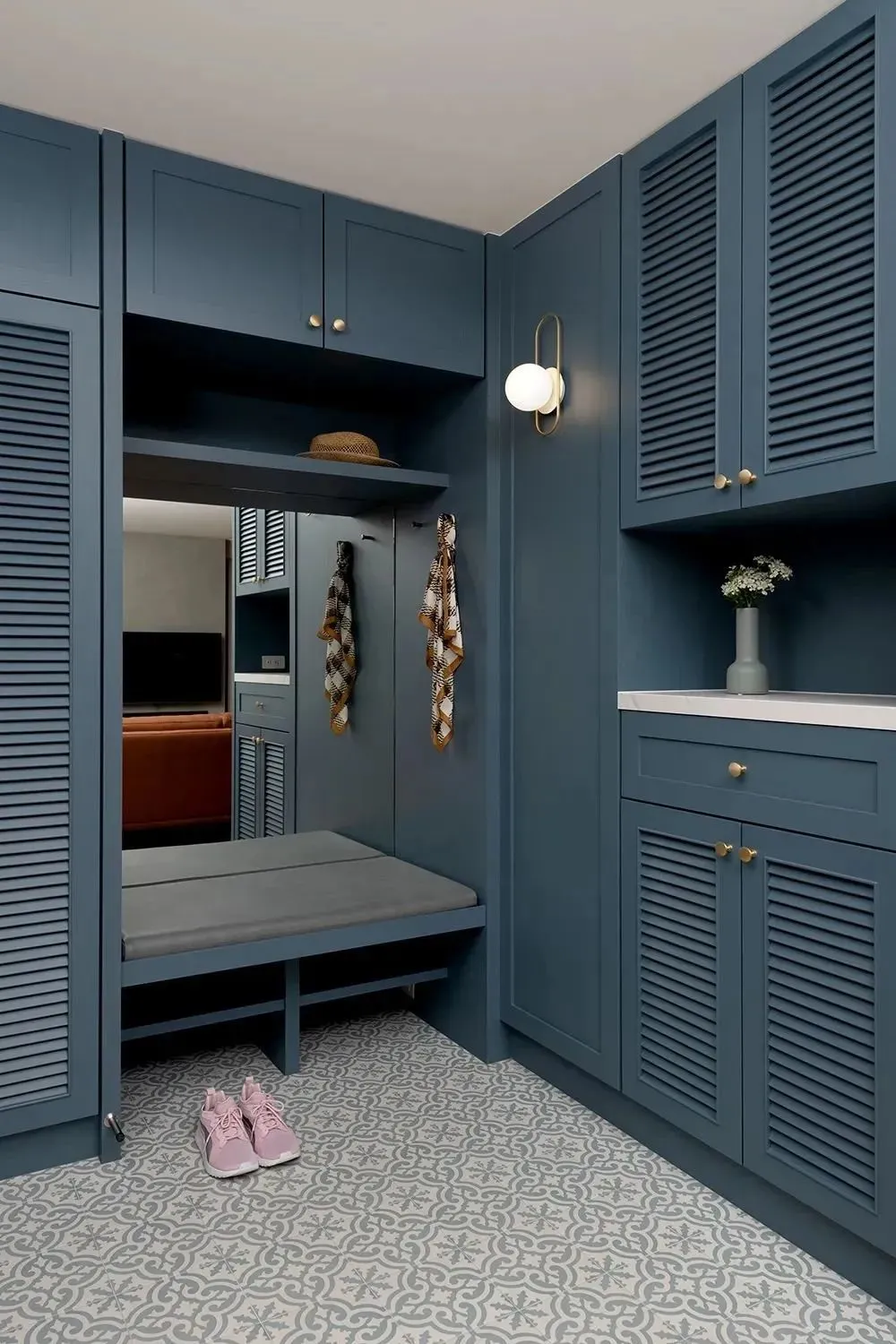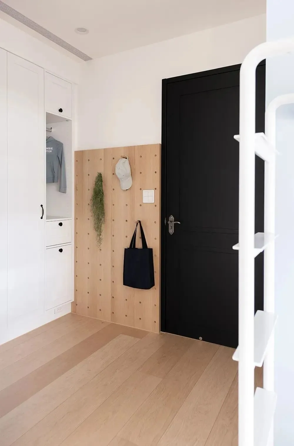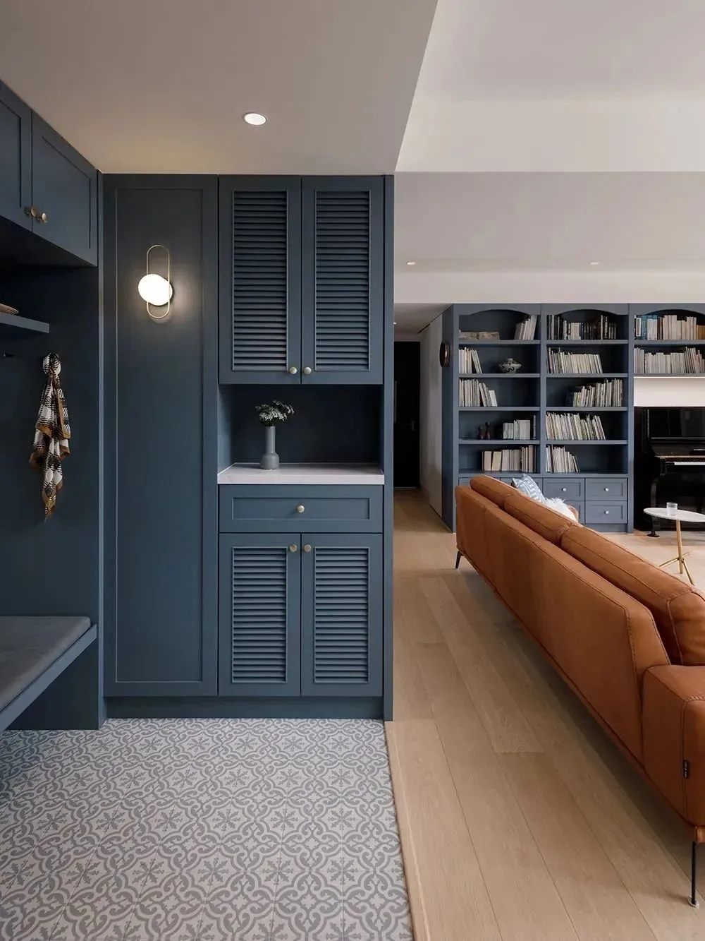 Both shoe cabinets and wardrobes are thoughtfully equipped with louvered door panels, which is convenient for temporary storage of clothes and shoes when going out and keeping ventilation. The retro tiles laid on the ground are not only stain-resistant and easy to care for, but also add a sense of ceremony at the first glance of returning home, making every time you go home calm and comfortable.