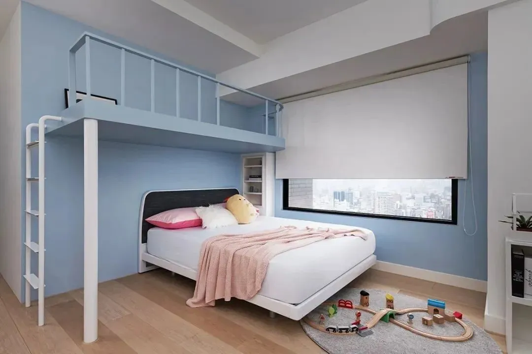 The children’s room continues the blue theme of public spaces. The hole board next to the wardrobe is convenient for children to hang clothes and small objects at hand. In order to increase interest and space utilization, the designer abandoned the traditional single-storey bed and cleverly created a small attic on the upper floor. The wall at the original ladder was partially demolished, retaining the independence of the space. Children can climb up to their own secret base through cute ladders, which is both a play corner and an intimate little place for whispering.