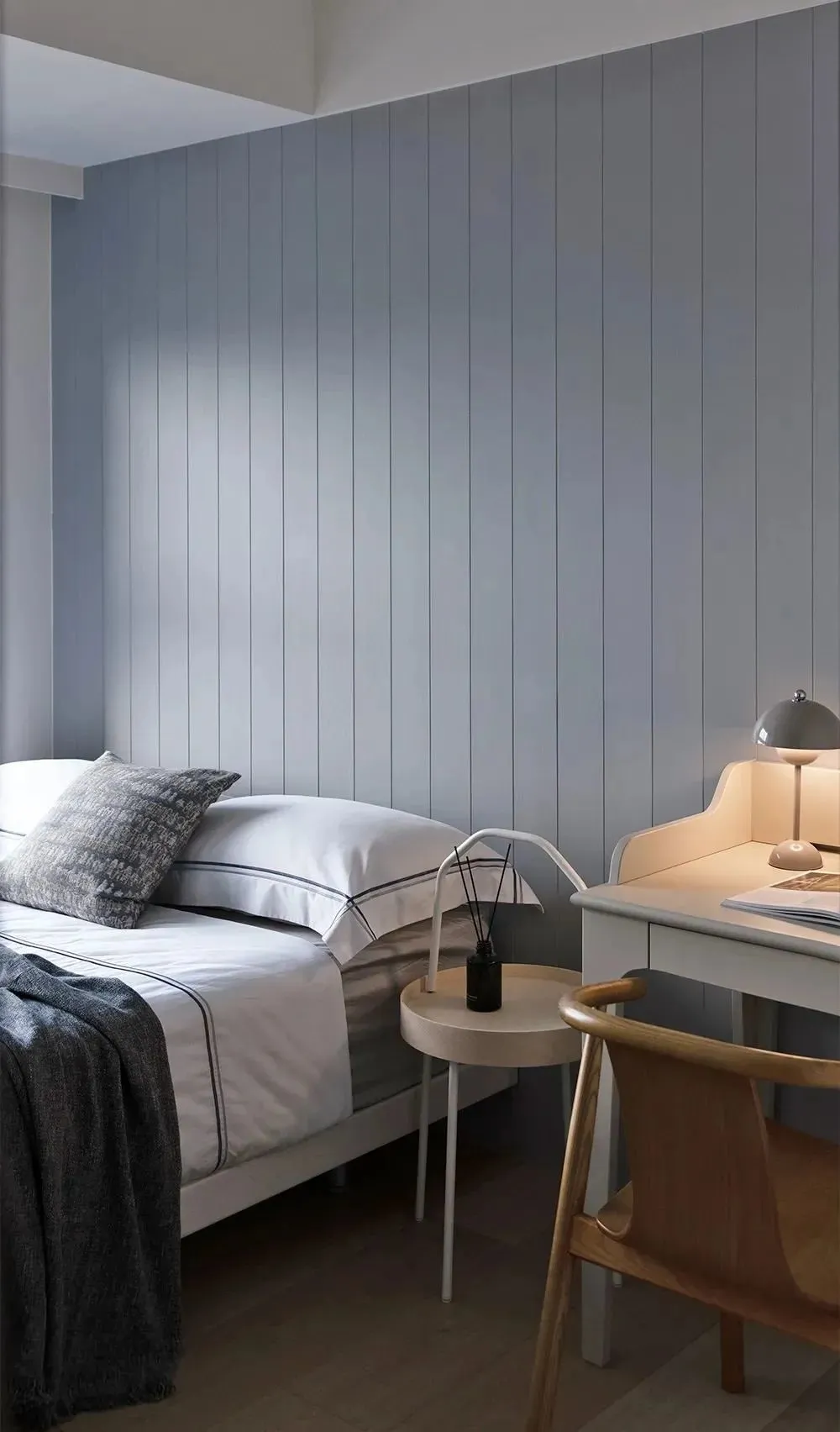 The guest rooms are in tones similar to the overall. The head of the bed is set with a wide grille as the background, and the shape is simple and neat. At present, it is arranged with movable furniture, which maintains the flexibility of space use and facilitates easy adjustment of functions according to needs in the future.