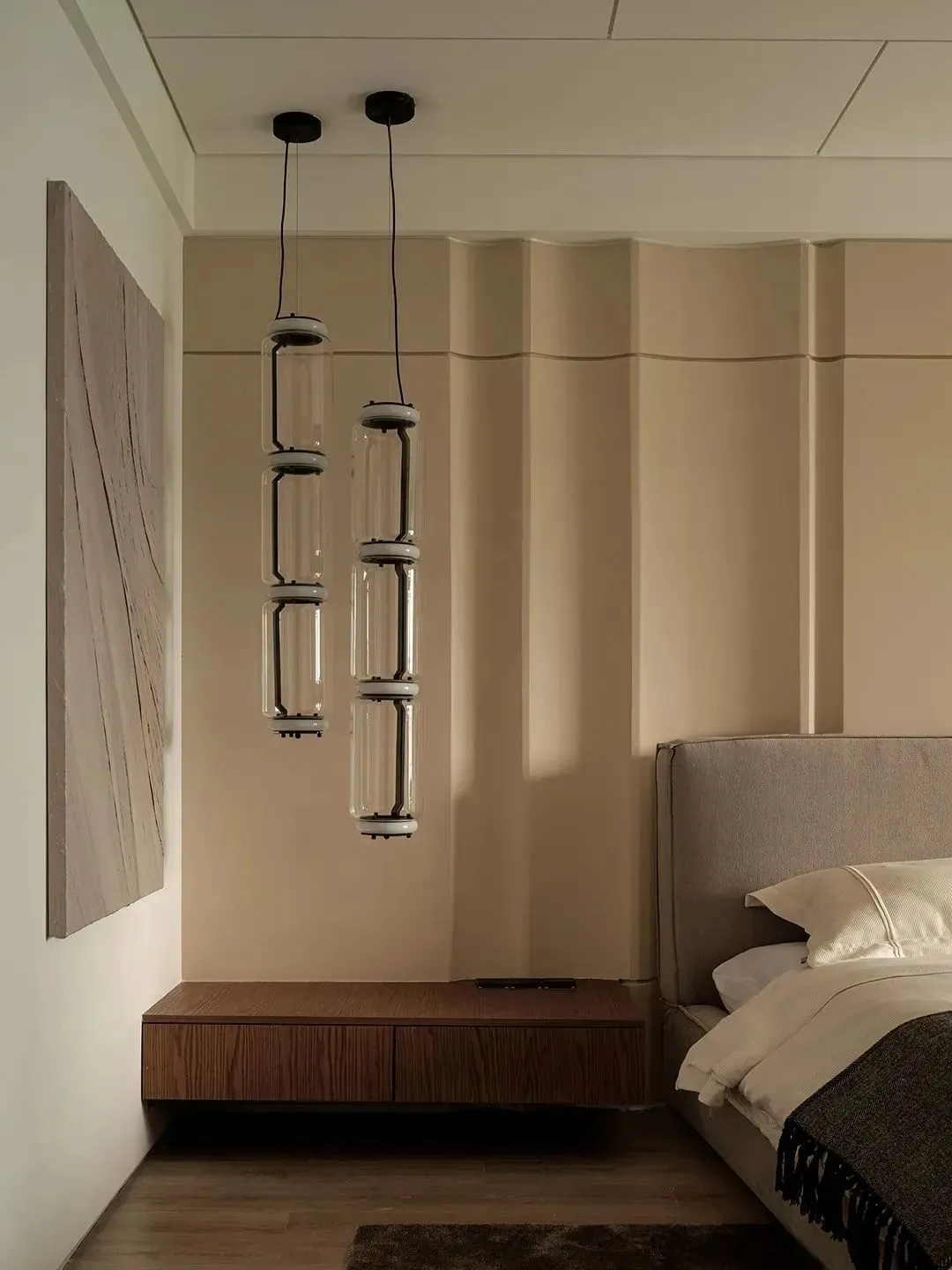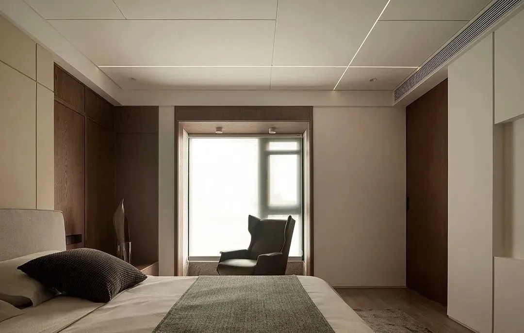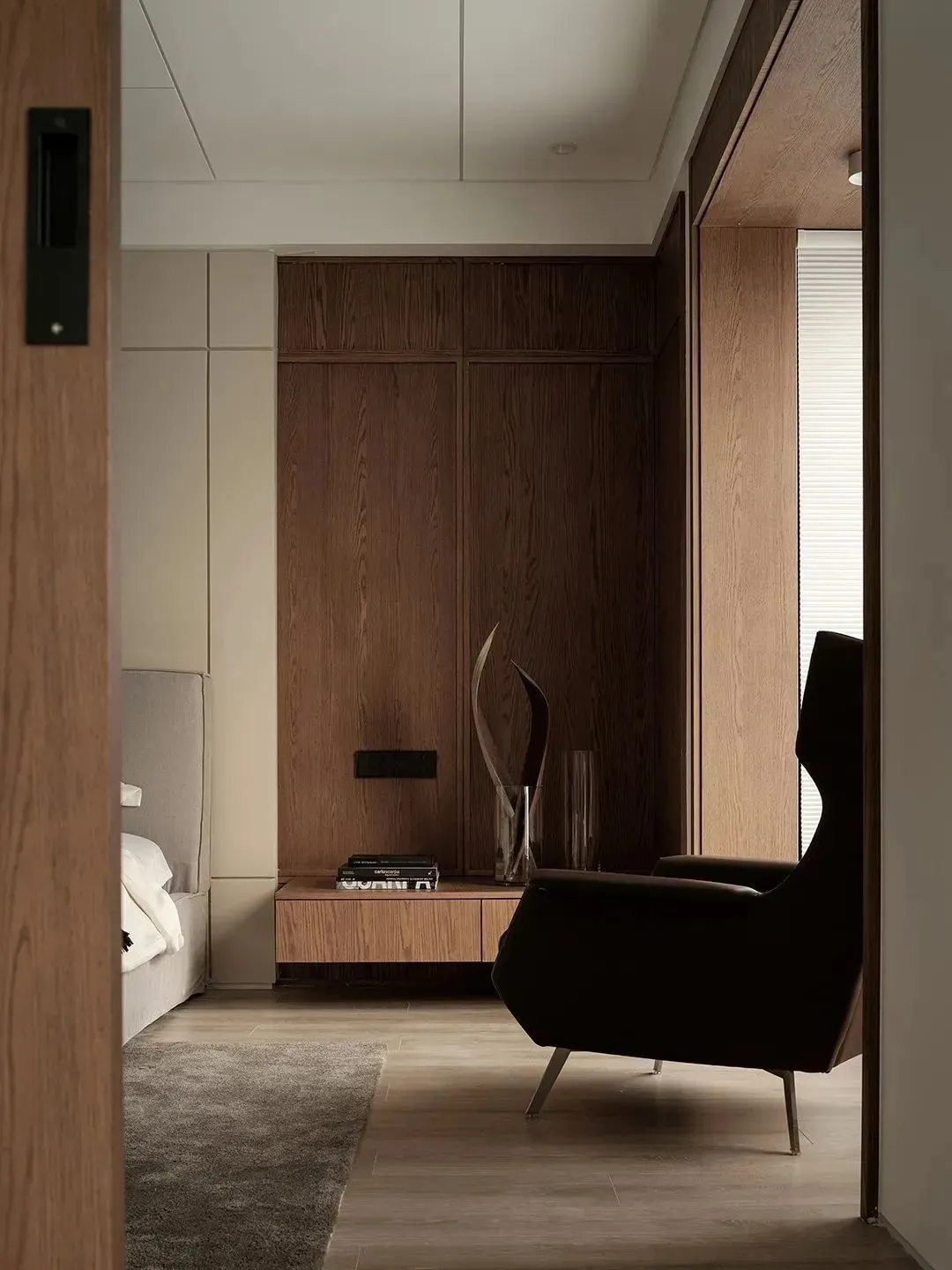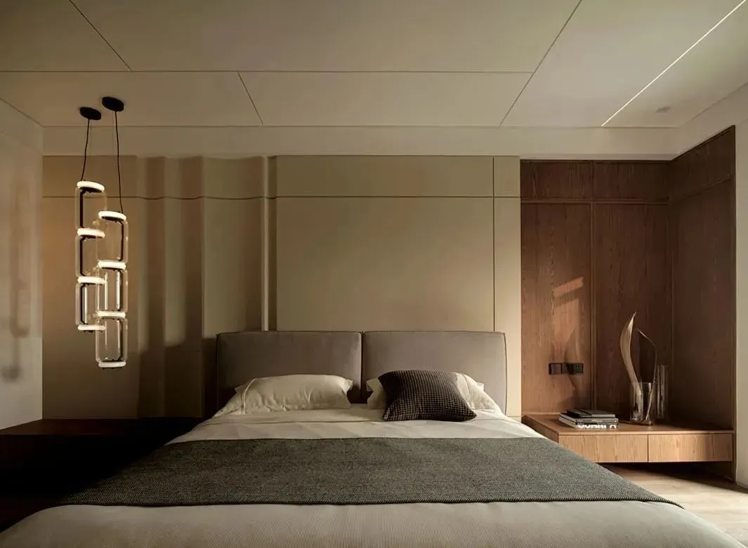 The blank wall and soft light together create a quiet and comfortable master bedroom environment.