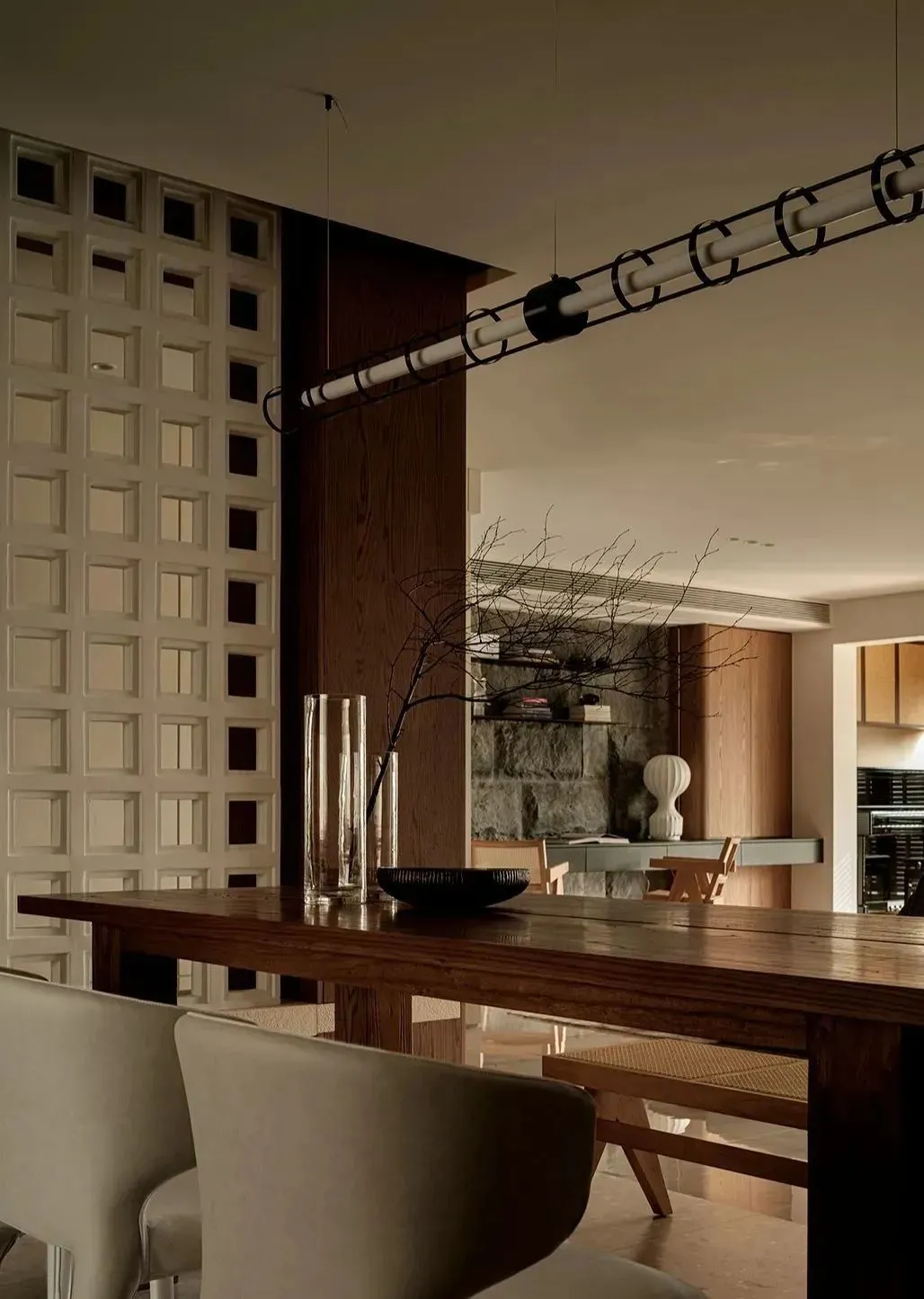 Artistic lamps combined with lines and arcs, paired with symmetrically placed dining chairs, add a full sense of ritual to every meal. Soft light and shadow are intertwined here, creating a conflicting and harmonious aesthetic feeling, which makes people feel the artistic flavor in life while enjoying delicious food.