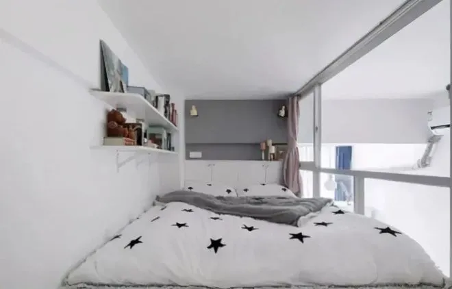 The bay window of the master bedroom extends a 1.2-meter-long desk, and the second bedroom is cleverly hidden above the glass staircase! All the stairs are made of ultra-white glass, which is full of transparency. The most amazing thing is that at the bottom of the stairs, a 1.8-meter-high cloakroom has been built, covered with clothes from all seasons, and people can stand upright and change clothes in it!