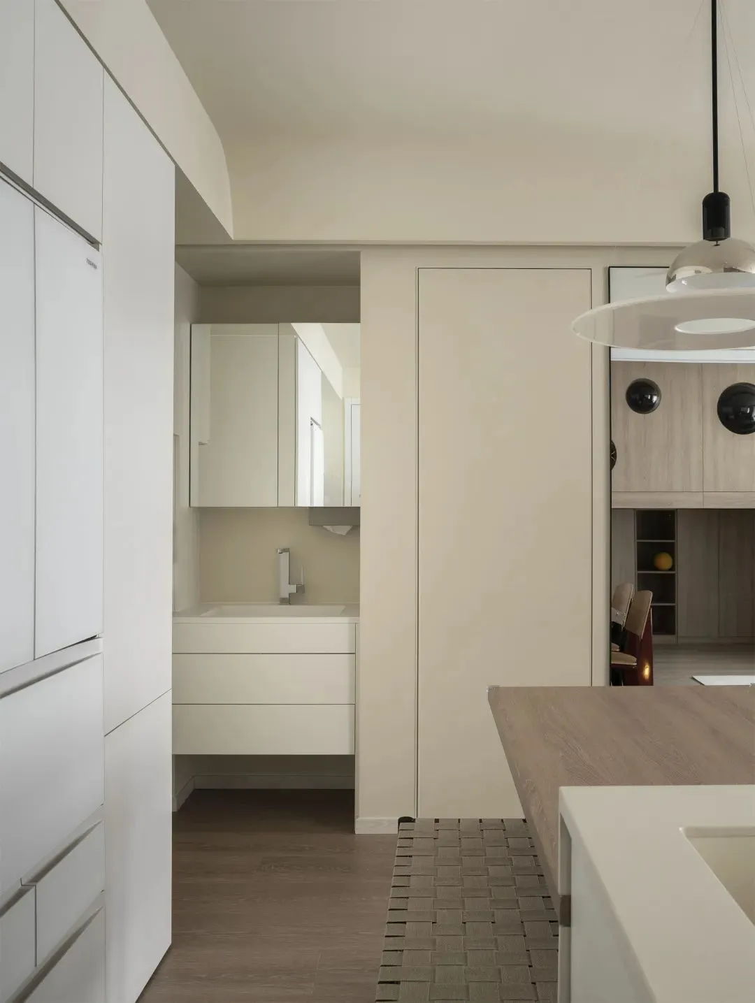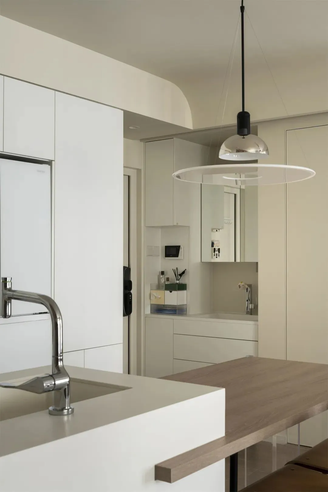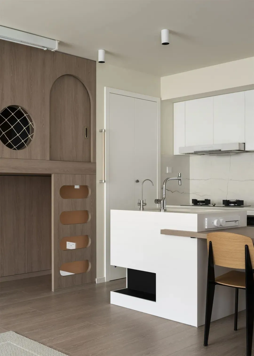 The left side of the original apartment entrance is the toilet, and the right side is connected to the kitchen, lacking independent porch and storage functions. The designer changed the kitchen to an open plan andUse the corner cabinet at the end of the cabinet to realize the entrance storage, the storage space for shoes and coats is enough.