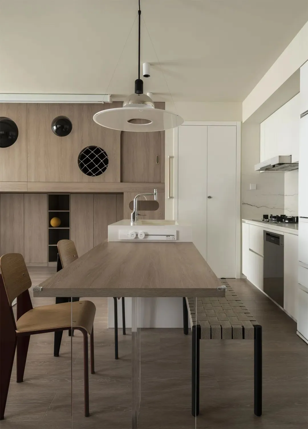 The dining area can be used by four people at the same time. The kitchen side choseRattan benchInstead of traditional dining chairs, it can be completely received under the table when not in use, keeping the aisle spacious.