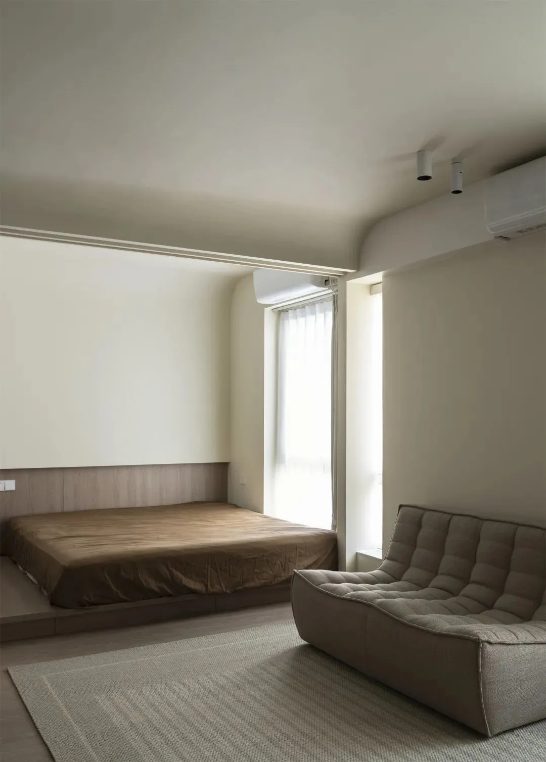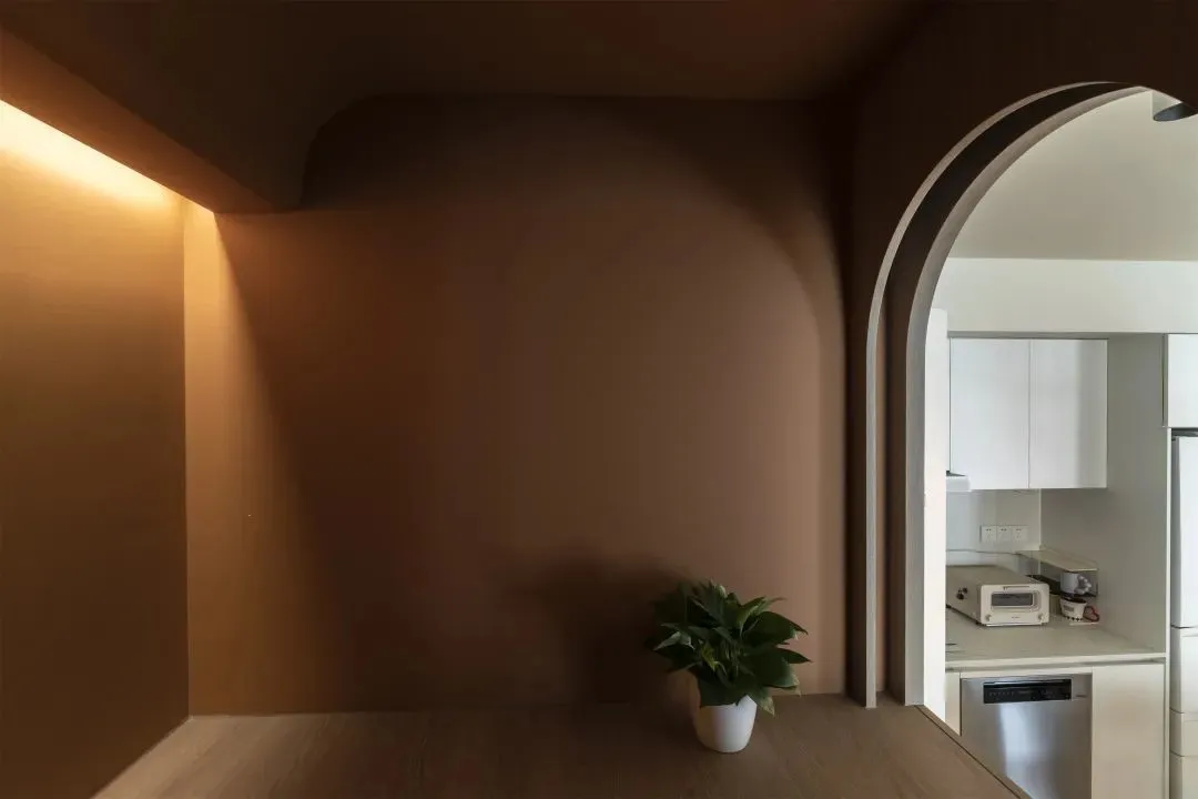 There is a structural beam above the entrance to the bedroom, which the designer cleverly usedCurved top surfaceModeling, when there is no ceiling in public areas, perfectly blocks this defect.