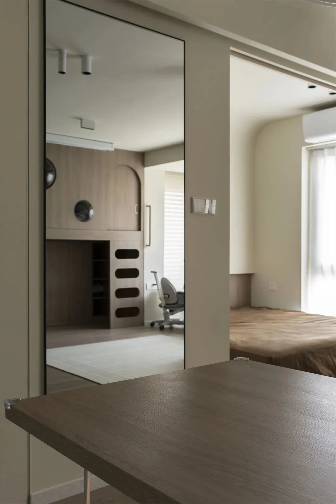 Across from the children’s room is the master bedroom. To save space, adoptFloor bedInstead of a regular bed frame. Considering that the 2-year-old son is still young, for the convenience of care, the master bedroom is temporarily open for treatment. The designer reserved in advanceSliding door track, can be changed to an independent bedroom at any time later.