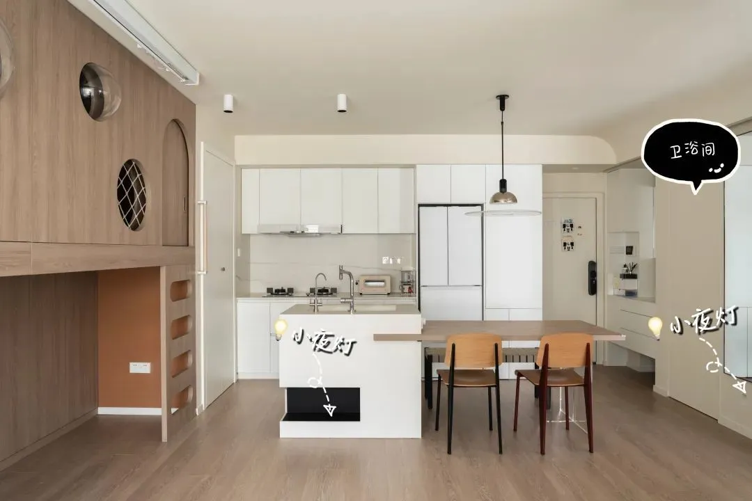 The night moving line of the children’s room will pass through the dining area, and the designer has set up the door of the island platform and bathroom respectivelySensor night light, you can see clearly without turning on the lighting of the whole house, which is very considerate ~