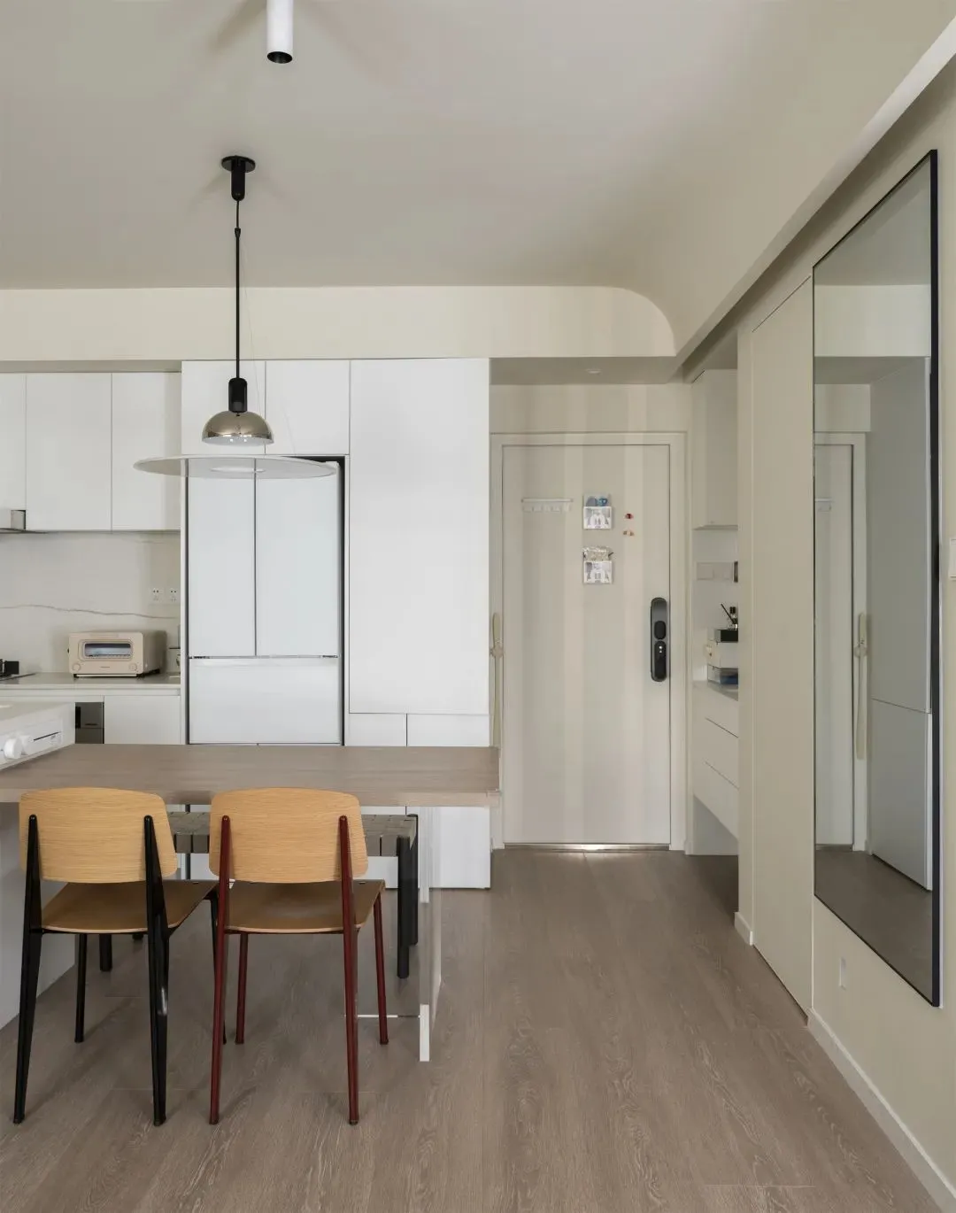 The bathroom was too small to fit the washing machine, so we used the kitchen drain next to the position to separate aSeparate laundry room。 Stacking the washing and drying set up and down saves space, and also solves the problem of not having a balcony to dry clothes.