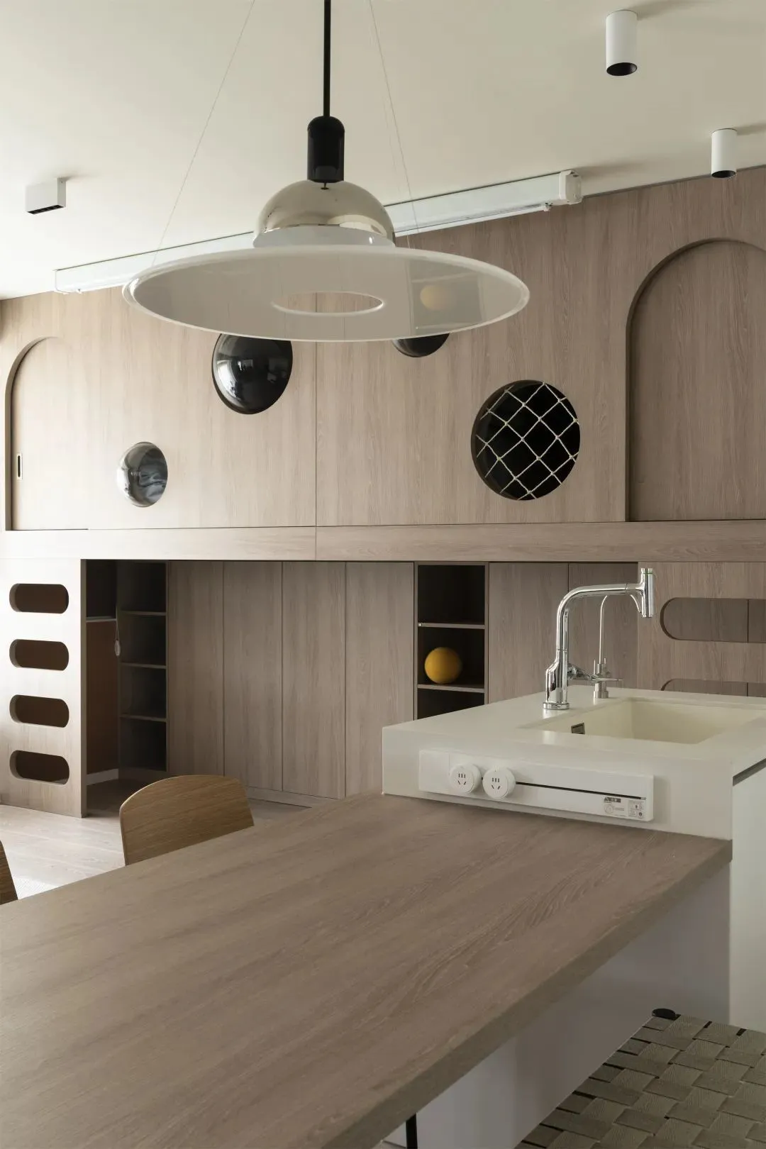 The kitchen wall and island facade are all adoptedRock slab, the echo on the material unifies the vision and is easy to take care of. Nakajima has designed a sink, installed a water purification system inside, and installed a track socket on the side to facilitate the use of small household appliances. The owner’s family usually eats simple meals with less oil and salt, and the open kitchen is basically not troubled by oil fume.