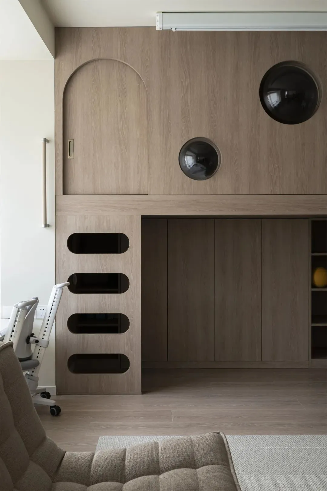 The two sleeping cabins are equipped with independent entrances, separated in the middle.This not only saves space, but also ensures their independence. At the same time, the close distance can make the two children feel that they are not separated. The two rooms are also specially designed with “small mechanisms”-four different sizesCircular window, playful and cute, enhances the interaction with the external space, and is also conducive to the interior ventilation and breathability of the children’s room.