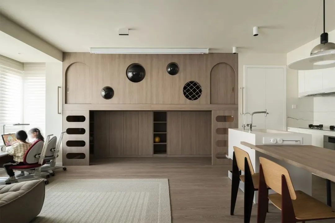 Looking from the kitchen area to the living room, study area and children’s room, you can have a panoramic view of every corner of the home on the dining island, and parents can see the children’s situation at any time.