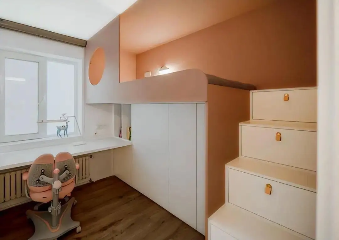 The lower bed space and stair steps also have storage functions, fully meeting the storage needs. A shelf desk is set by the window, which provides a corner for children to learn and read without wasting any space.