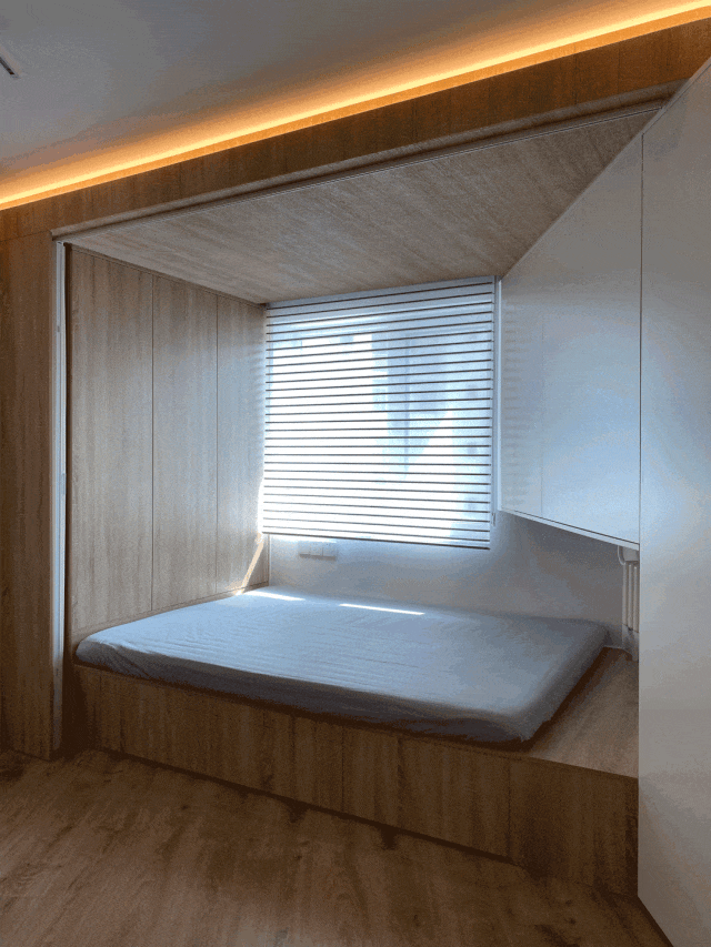 The designer made use of the irregular corner by the window to create a tatami area, which not only solved the problem of temporary accommodation and storage, but also facilitated the elderly to look after their children. Foldable soundproof curtains are installed, which will not affect indoor lighting when folded at ordinary times.