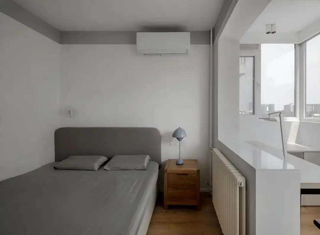 The master bedroom has a small area. By customizing the combination design of bed and wardrobe, it meets the dual needs of sleeping and storage, and improves the space utilization rate. After being connected with the adjacent balcony, a desk is placed, which solves the need of working from home.