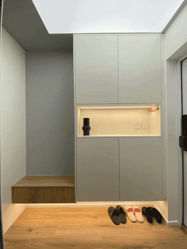 On the right side of the entrance door, a top-through shoe cabinet is customized. The middle is empty for easy placement of small objects. The bottom is suspended for storing often worn shoes, and a hidden light strip is embedded, taking into account both beauty and practicality. There is also a hanging shoe changing stool reserved next to it, which makes it easier to enter and leave the house.